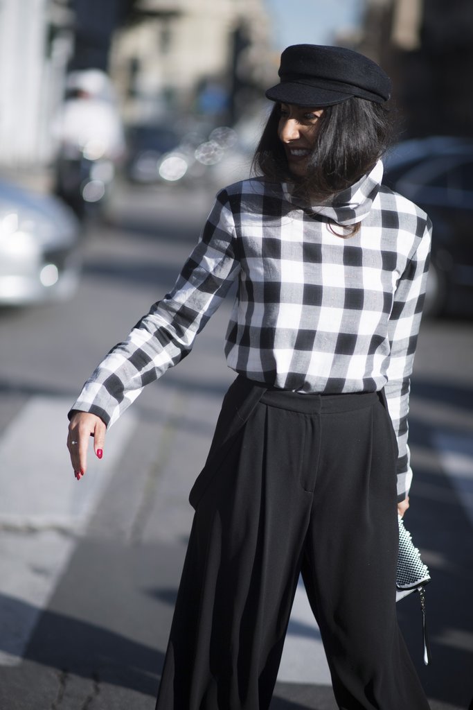 Chẳng phải ai xa lạ, hoạ tiết kẻ sọc gingham chính là “ma cũ” bỗng chốc quay trở lại và khuấy động làng mốt mùa thu năm nay. Tín đồ thời trang nữ gạo cội này cũng không quên nhấn nhá chút phụ kiện lạ mắt như item mũ beret và túi tay cầm mang hơi hướng metallic.