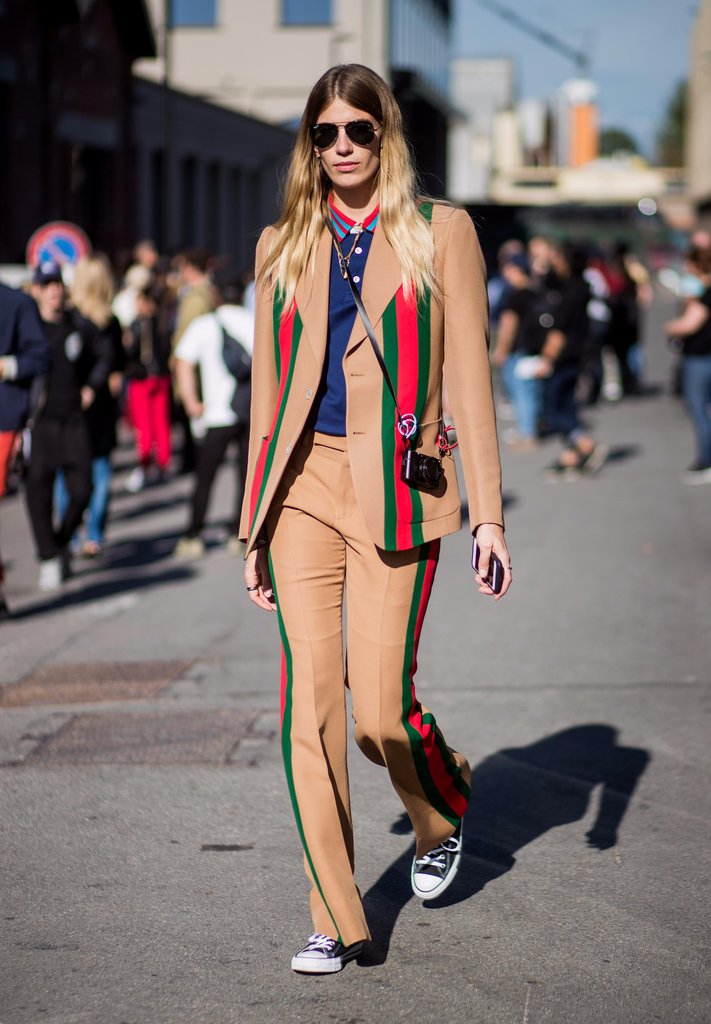 Là nhà mốt mở màn cho show diễn lần này, vì thế không mấy bất ngờ khi đồng loạt các fashionista chơi cả cây đồ hiệu Gucci xuất hiện tại MFW. Bên cạnh đó, màn mix&match tài tình giữa bộ đôi suit và giày sneaker đến từ Converse tưởng không hợp mà hợp không tưởng.