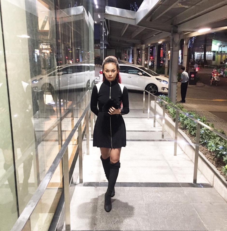 Cô nàng Mai Ngô cá tính diện nguyên set đồ all-black cho ngày đầu năm mới. Cách kết hợp boots cao cổ cùng váy ôm eo và kiểu tóc chải ngược mang lại cho Mai Ngô vẻ ngoài có chút “dừ” hơn bình thường.