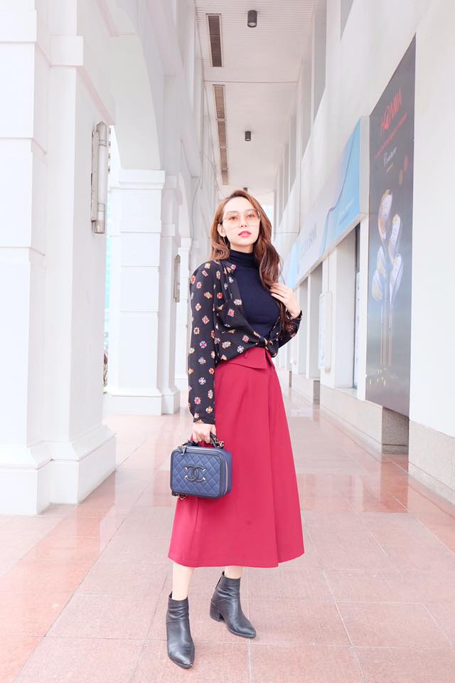 Minh Hằng chưa bao giờ khiến các khán giả thất vọng về phong cách cá nhân. Ngày đầu tiên của năm 2017, cô nàng chọn chân váy dài quá đầu gối màu đỏ tươi tắn. Đi kèm với đó là áo cổ cao và vest họa tiết cách điệu bên ngoài. Đương nhiên những phụ kiện như mắt kính hay túi xách là không thể thiếu mỗi lần Minh Hằng ra phố.