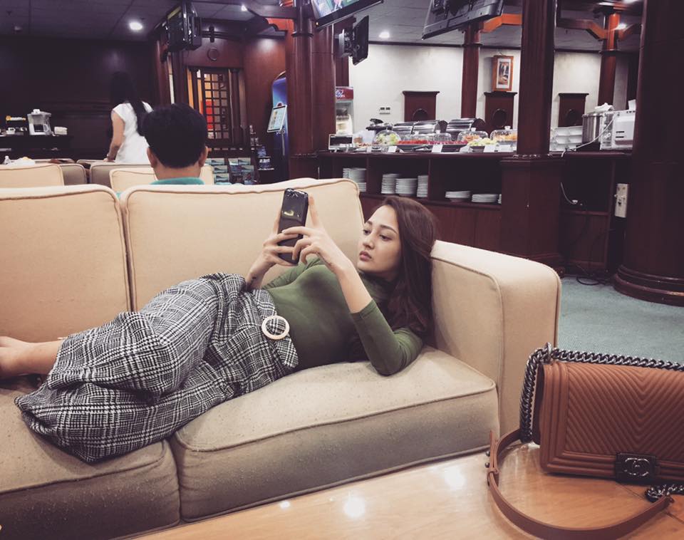 Bảo Anh vẫn miệt mài với những chuyến bay chạy show. Cô nàng diện áo dài tay bó sát cùng quần culottes kẻ sọc.