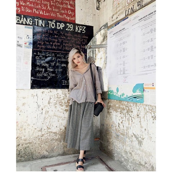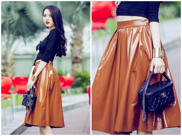 Mẫu túi dáng hộp thương hiệu Chanel mang đến vẻ ngoài cổ điển với cách mix cùng chân váy da dáng xòe dài.