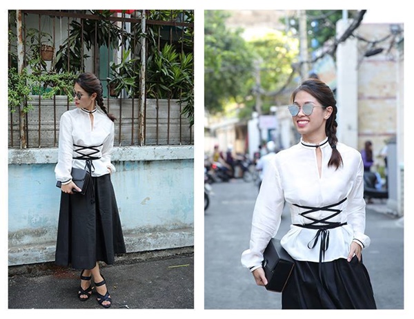 Fashionista Hà Mi thanh lịch với chiếc túi hộp đen đơn giản mà tinh tế trên đường phố.