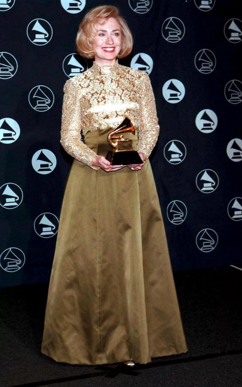 Trong lễ trao giải Grammy 1997, Hillary sang trọng trong bộ váy màu xanh nền nã. Những chiếc áo cao cổ là lựa chọn thường xuyên của bà.