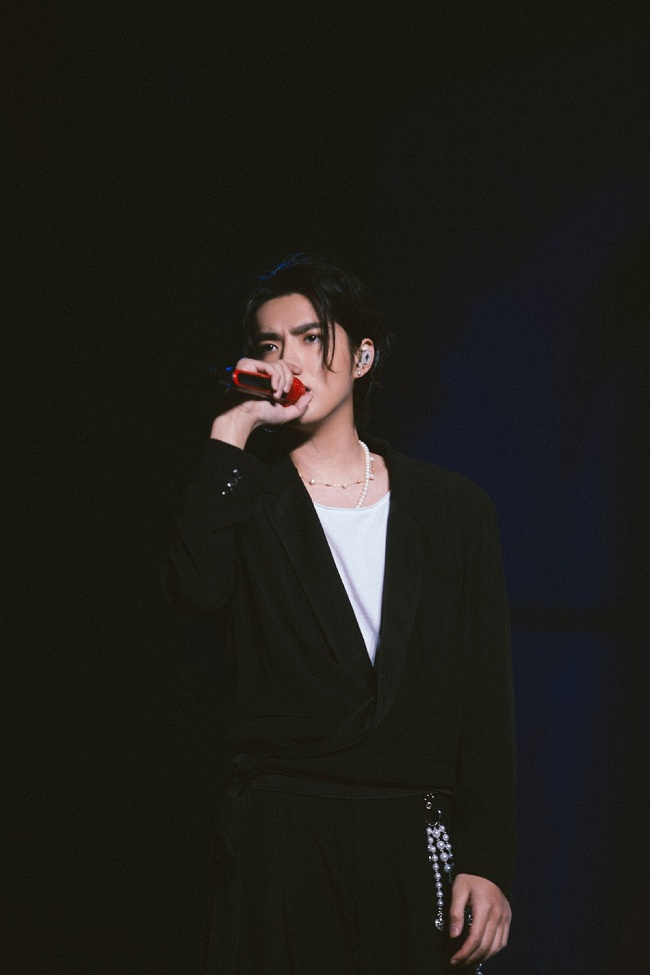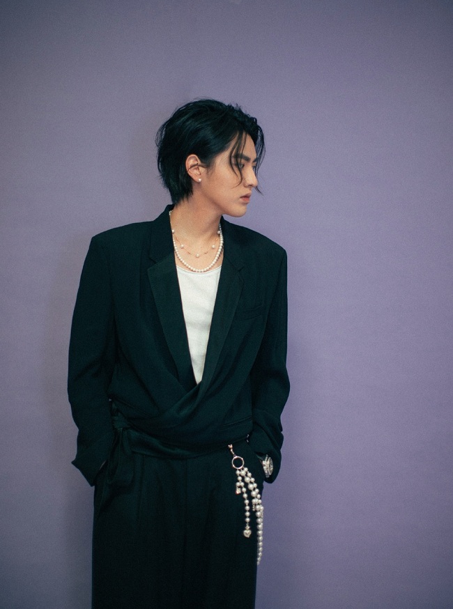 Trang phục kiểu áo blazer vạt chéo mix cùng đặc biệt style mái tóc chia ngôi rũ xuống khuôn mặt nhìn nghiêng trông anh như con gái