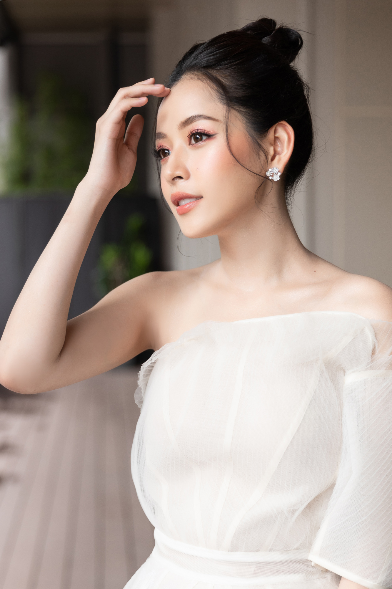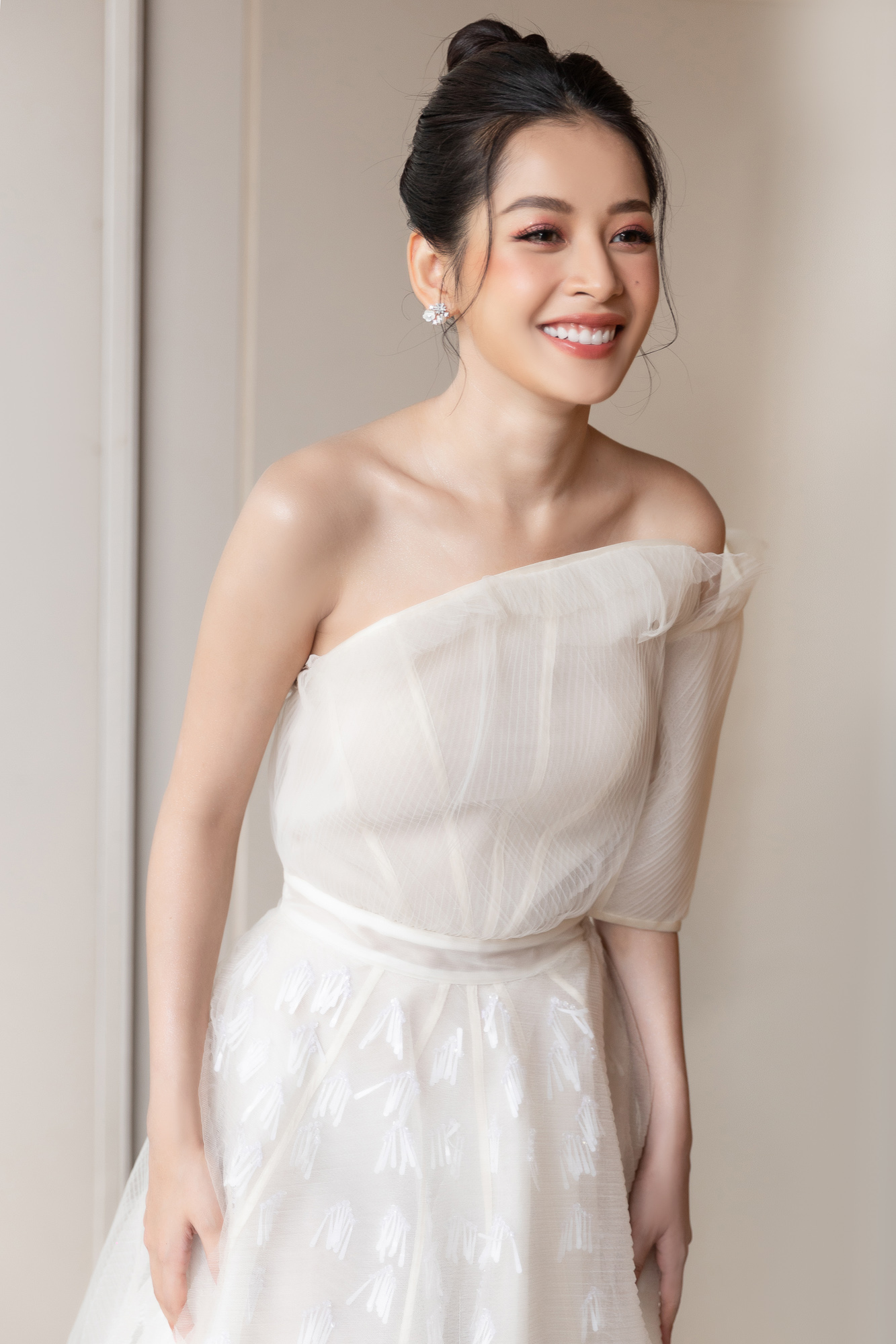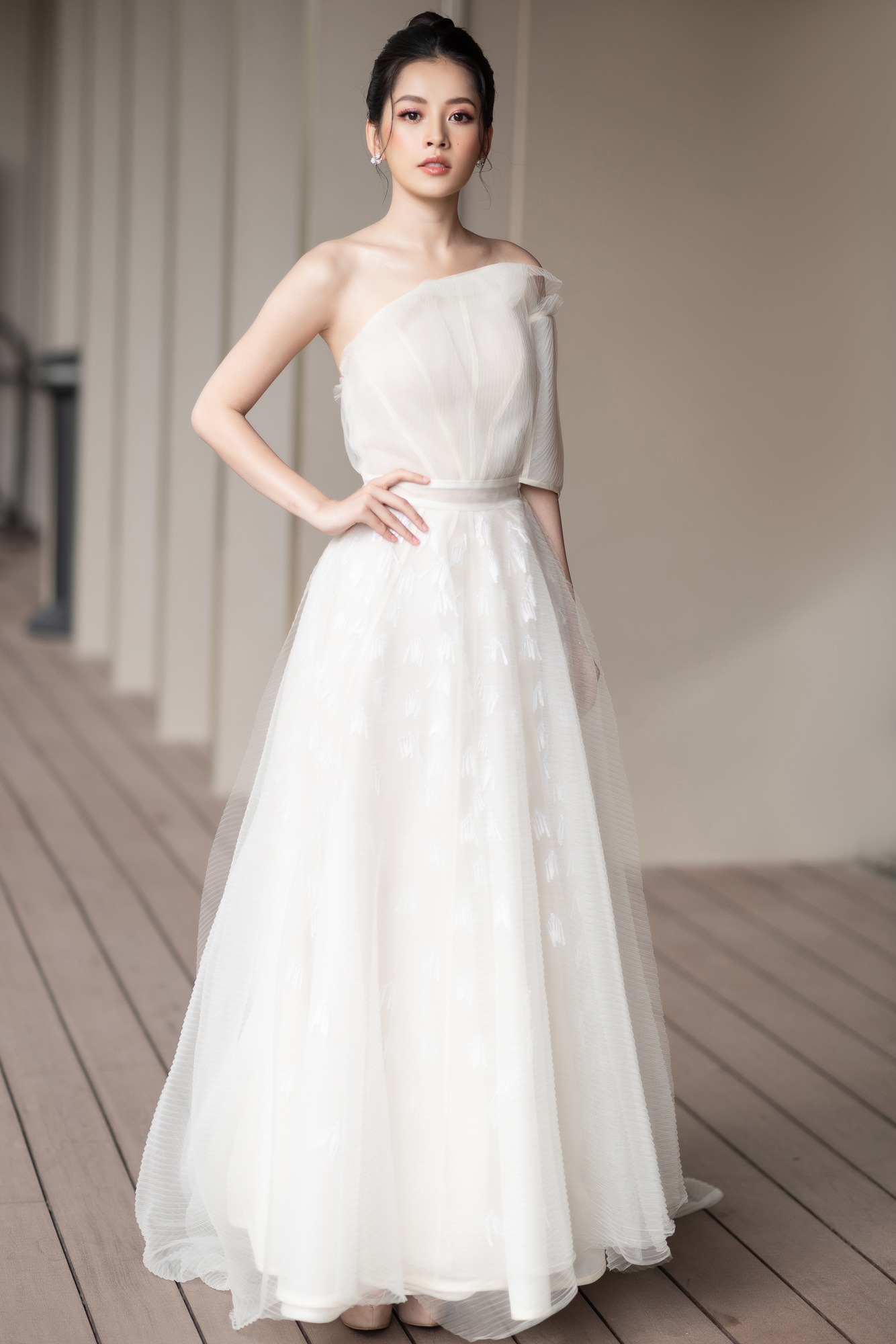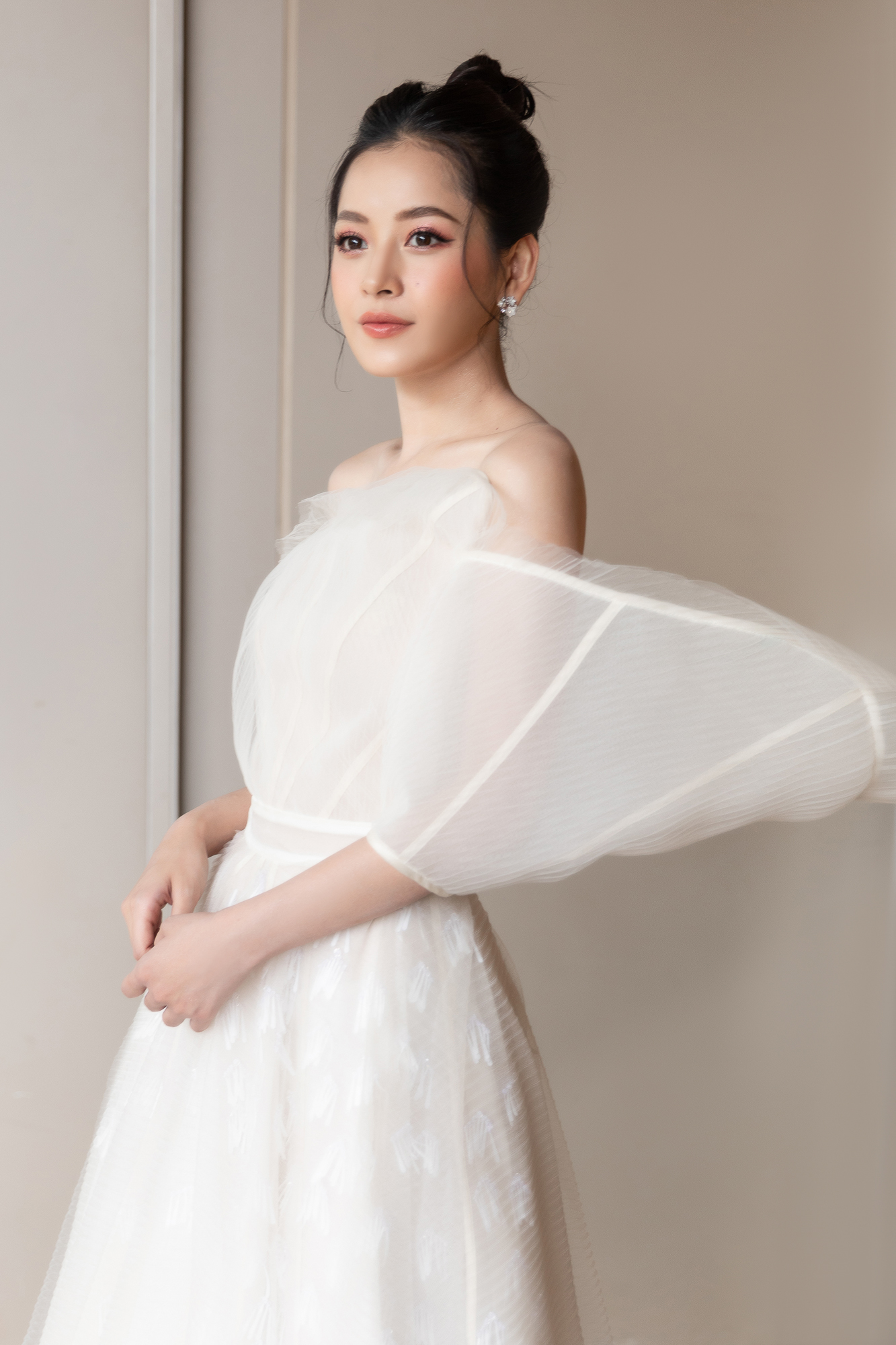 Không thiên về cách xử lý đính kết như những mẫu đầm cưới truyền thống, sáng tạo lần này được Chi Pu lựa chọn kiến tạo theo phong cách bất đối xứng, vừa tạo nét cá tính mà vẫn giữ trọn sự nhẹ nhàng cho các cô dâu trong ngày cưới.