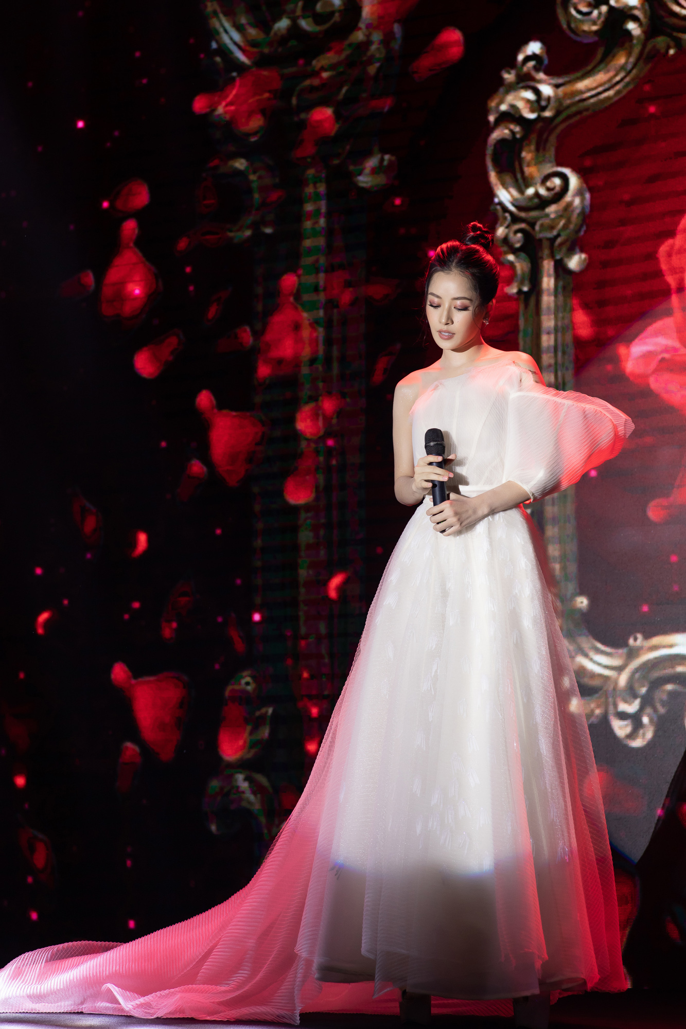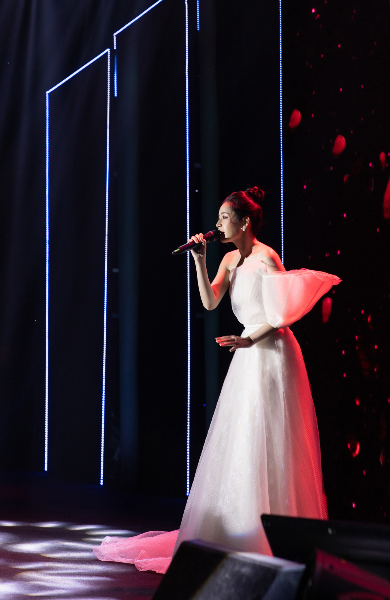 Ngoài ra, khi xuất hiện trên sân khấu, bộ váy cũng làm tròn trách nhiệm khiến nữ ca sĩ “tỏa sáng”. các lớp vải tuyn, organza xếp chồng tạo độ phồng bồng bềnh, nhẹ nhàng tựa mây quấn theo từng bước chân người mặc.
