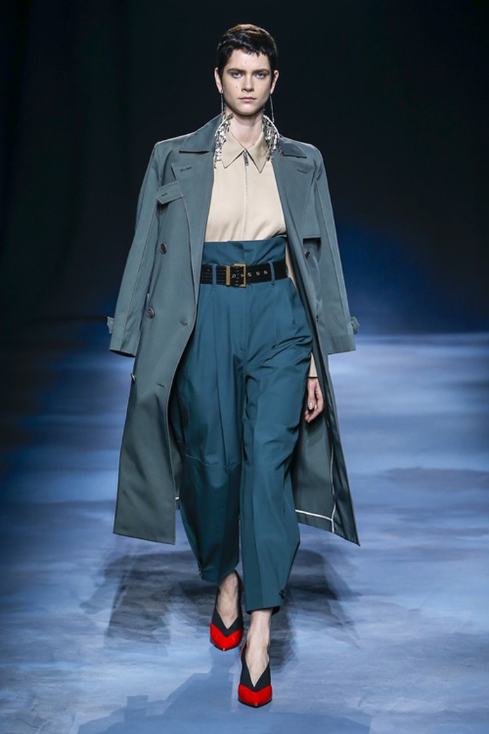 Givenchy đem đến gợi ý mix đồ cực chất nhưng vẫn đầy tính ứng dụng : sơ mi phối cùng quần cạp cao, áo khoác trenchcoat, phụ kiện đi kèm là thắt lưng và giày cao gót.
