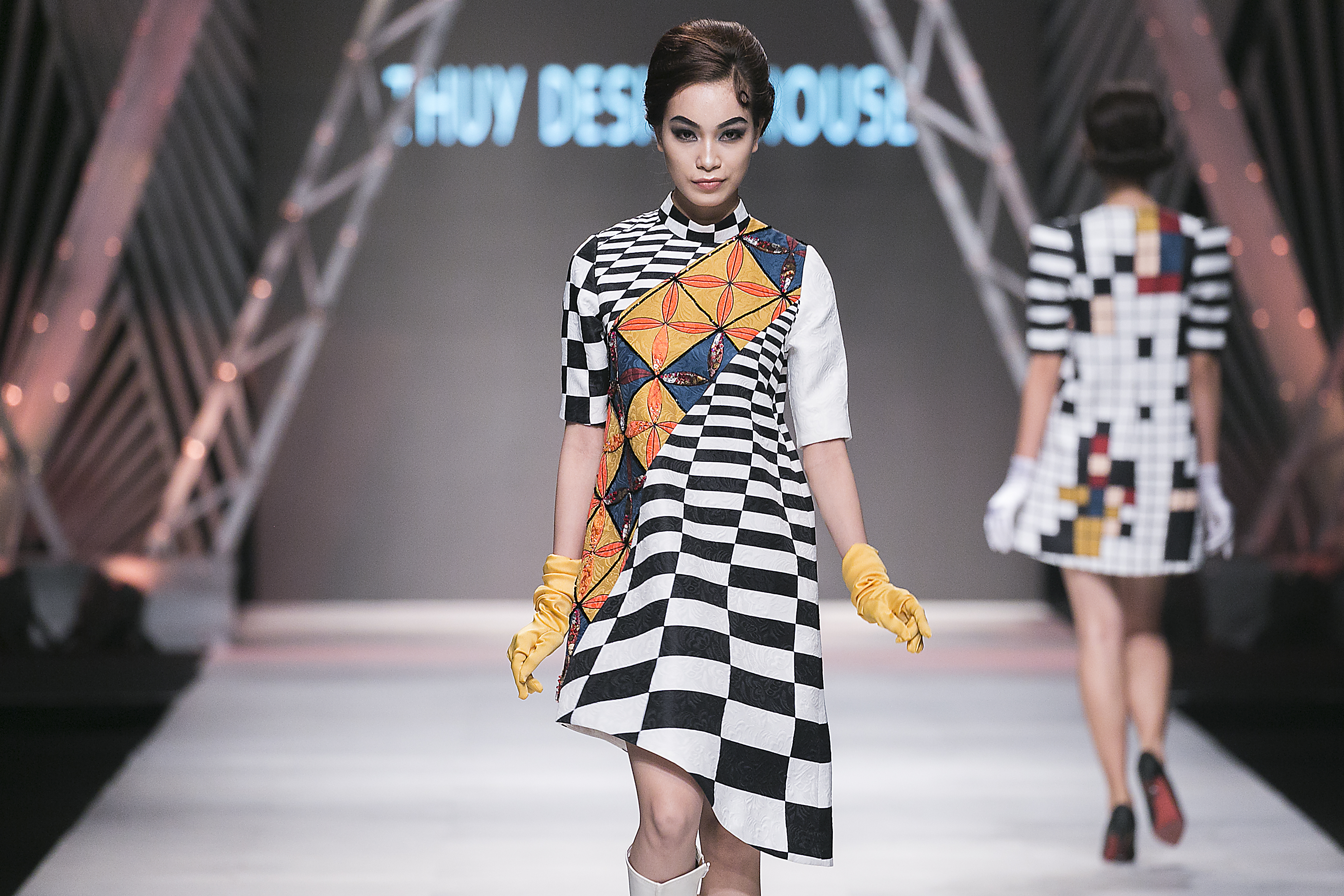 Phi lụa, phi dẻo, organza và các chi tiết đính kết bằng tay còn giúp tạo hiệu ứng nổi 3 chiều cho trang phục, kèm theo đó là sự gặp gỡ của các mảng màu tương phản, những đường ghép dứt khoác theo phong cách pop-art, xu hướng đặc trưng vào những năm 60.