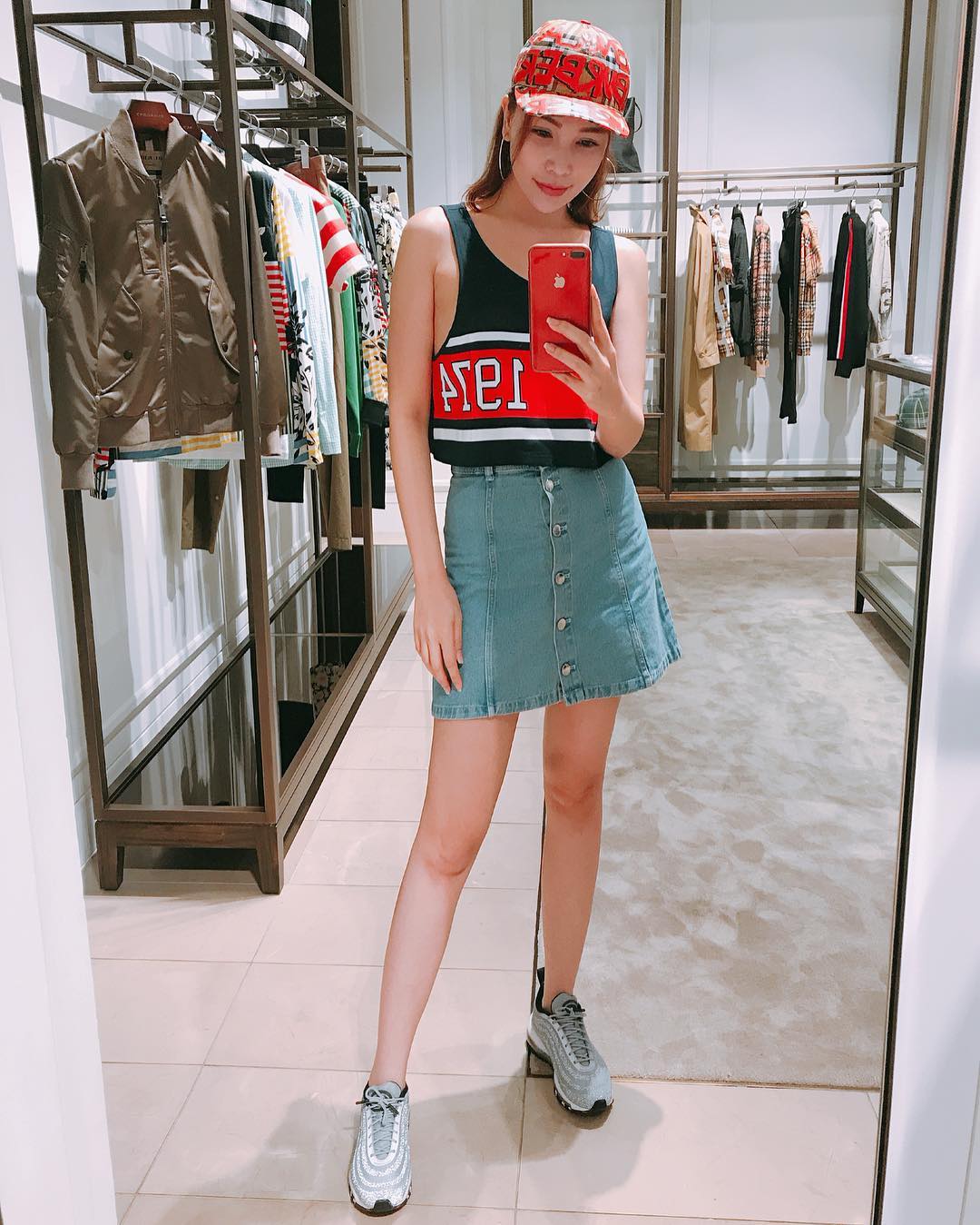 Người mẫu Quỳnh Thư trông trẻ trung cùng áo cộc tay tông đỏ phối với chân váy jeans. Đặc biệt, không thể không kể đến đôi giày Nike dáng “ông già” cực hot đang “gây bão”.