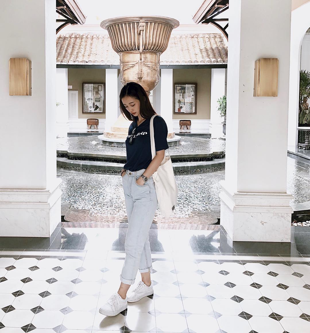 Tuy sở hữu chiều cao khiêm tốn, nhưng Jun Vũ vẫn vô cùng nổi bật khi diện áo thun đơn giản cùng quần jeans xắn lai. Bí quyết của cô nàng là đóng thùng trang phục nhằm khoe vòng eo, tôn lên tỷ lệ cơ thể.