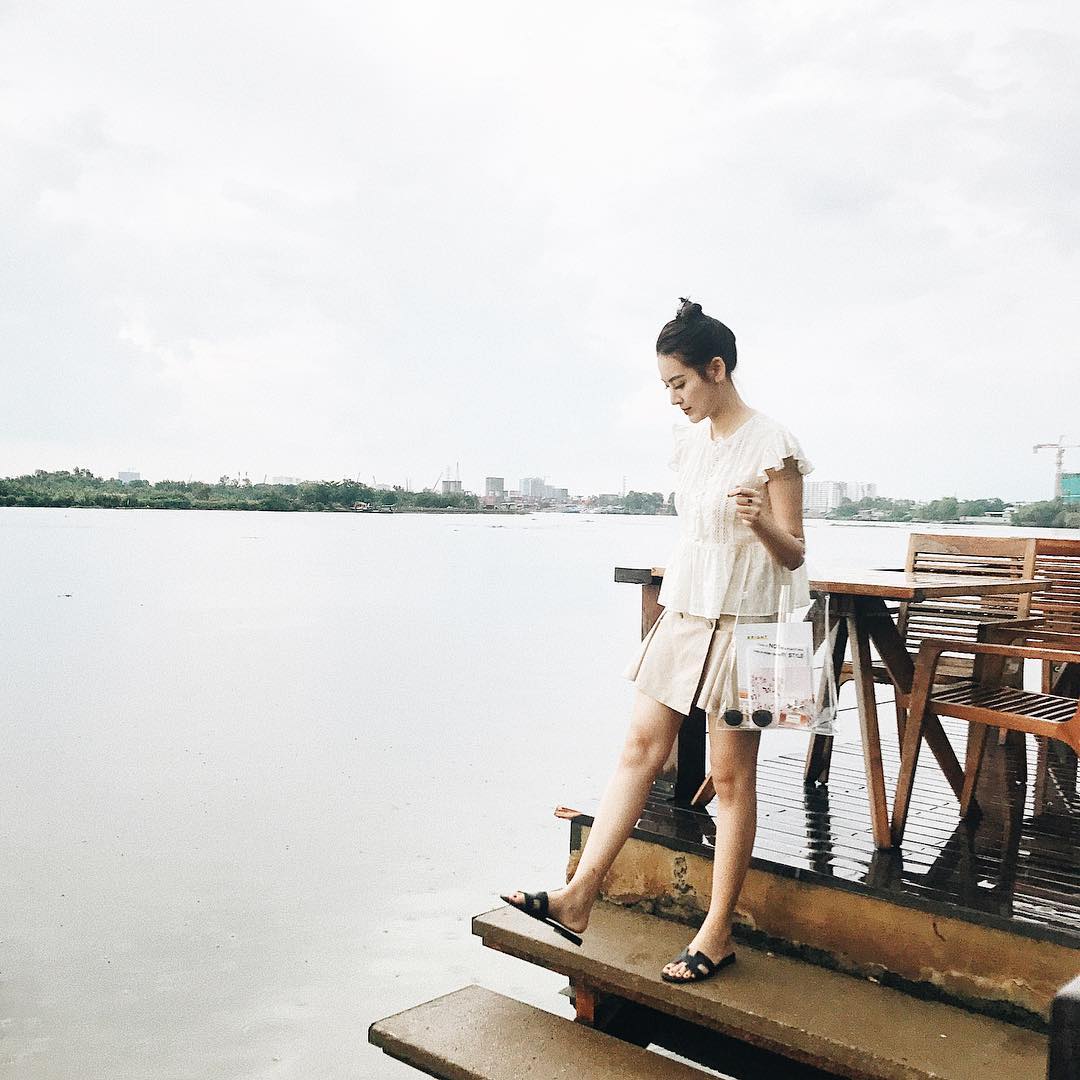 Hà Lade cũng lựa chọn đôi dép Hermes như Huyền My, nhưng cô nàng lại phối cùng chiếc váy linen nhẹ nhàng mix với túi xách trong veo cộp mác ngày hè.