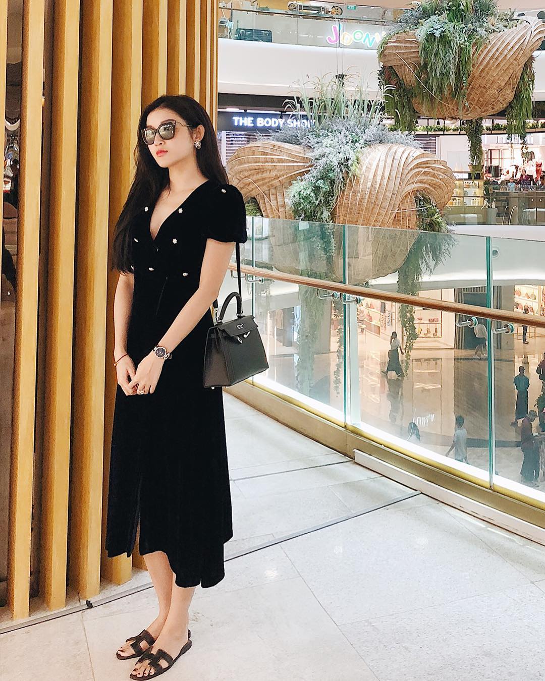 Huyền My thời thượng cùng dép Hermes phối với chiếc váy đen nhẹ nhàng, thanh lịch. Tham gia sự kiện thì thường mặc lỗi, nhưng khách quan mà nói, gu thời trang street style của người đẹp ngày thường cũng không đến nỗi nào.