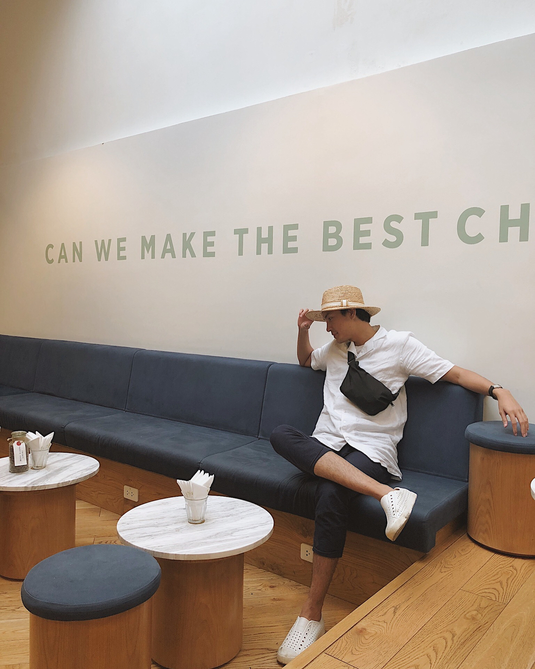 Combo áo sơ-mi trắng cùng mũ cói rộng vành đem lại cho Quang Đại không khí ngày hè.