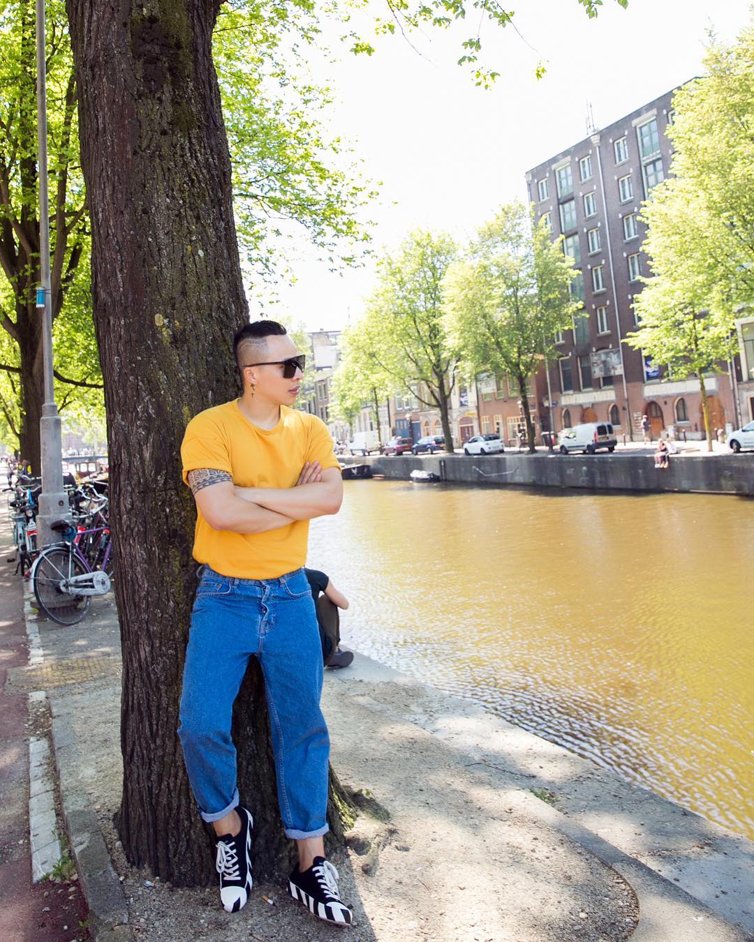 Cách “chơi” màu tương phản với áo phông vàng và quần jeans xanh là cách để Vũ Khắc Tiệp tự tin, tỏa sáng khi xuống phố ngày hè.