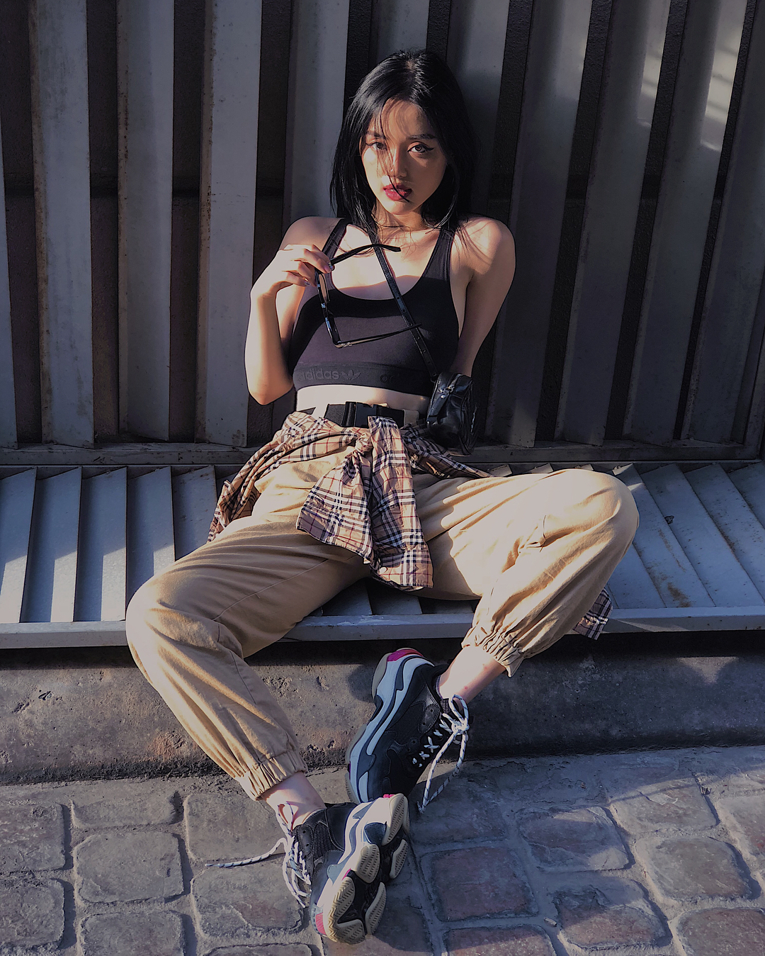Khánh Linh The Face thả dáng dưới phố cùng áo ba lỗ khoe eo thon, mix với quần jogger và áo sơ mi Burberry cột vạt.