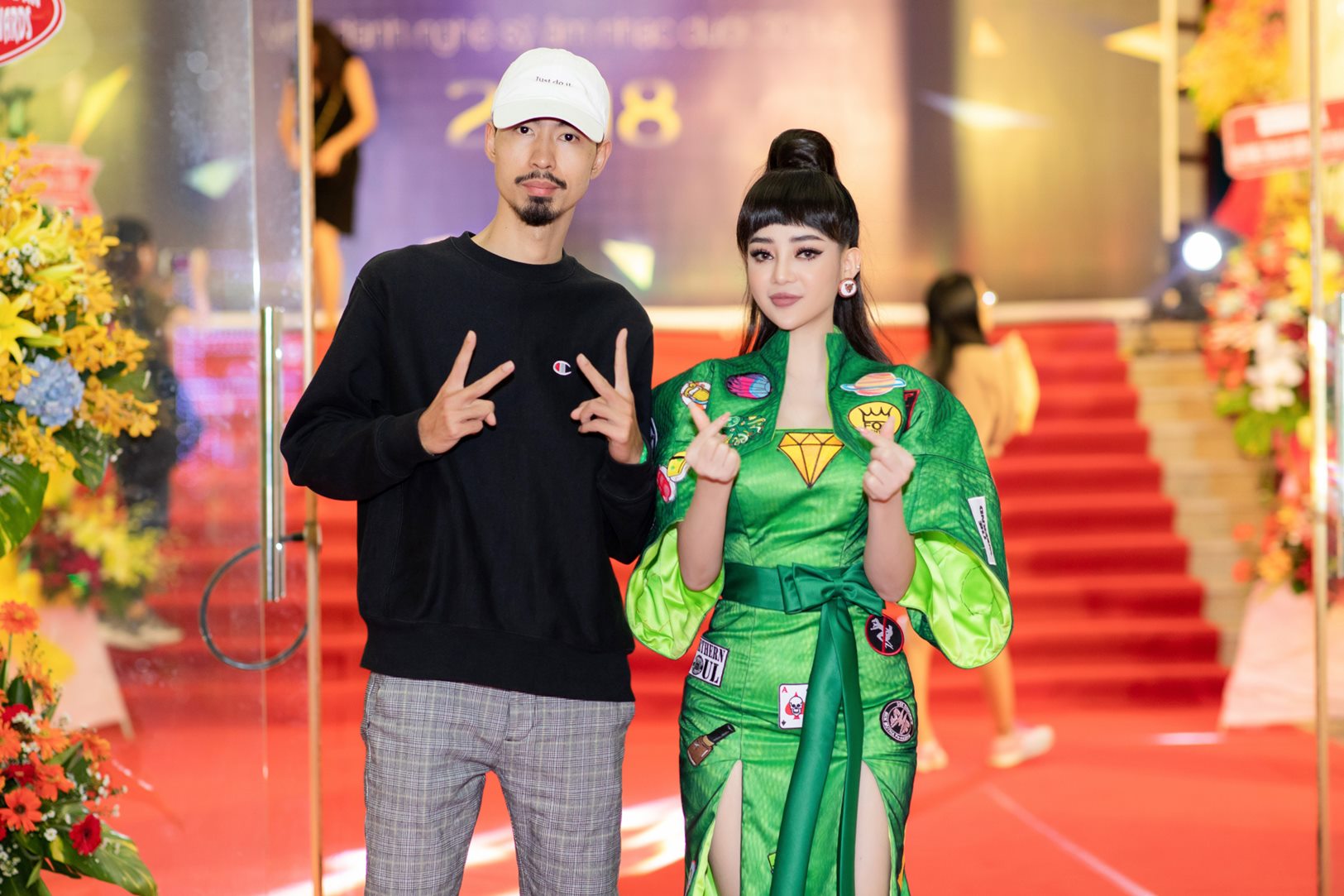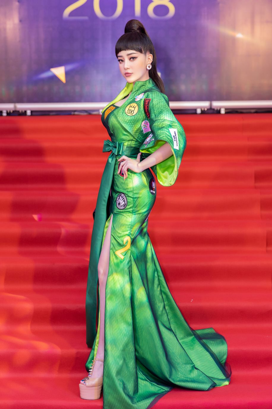 Được biết, trang phục lấy cảm hứng từ cartoon và các tấm sticker trên nền áo của người Nhật. Họa tiết trên áo là những nét đặc trưng của văn hóa Nhật Bản phối trên nền chất liệu xanh két, xanh lá non mang đến sự tươi trẻ và nằm trong bảng màu xu hướng chung của thế giới.