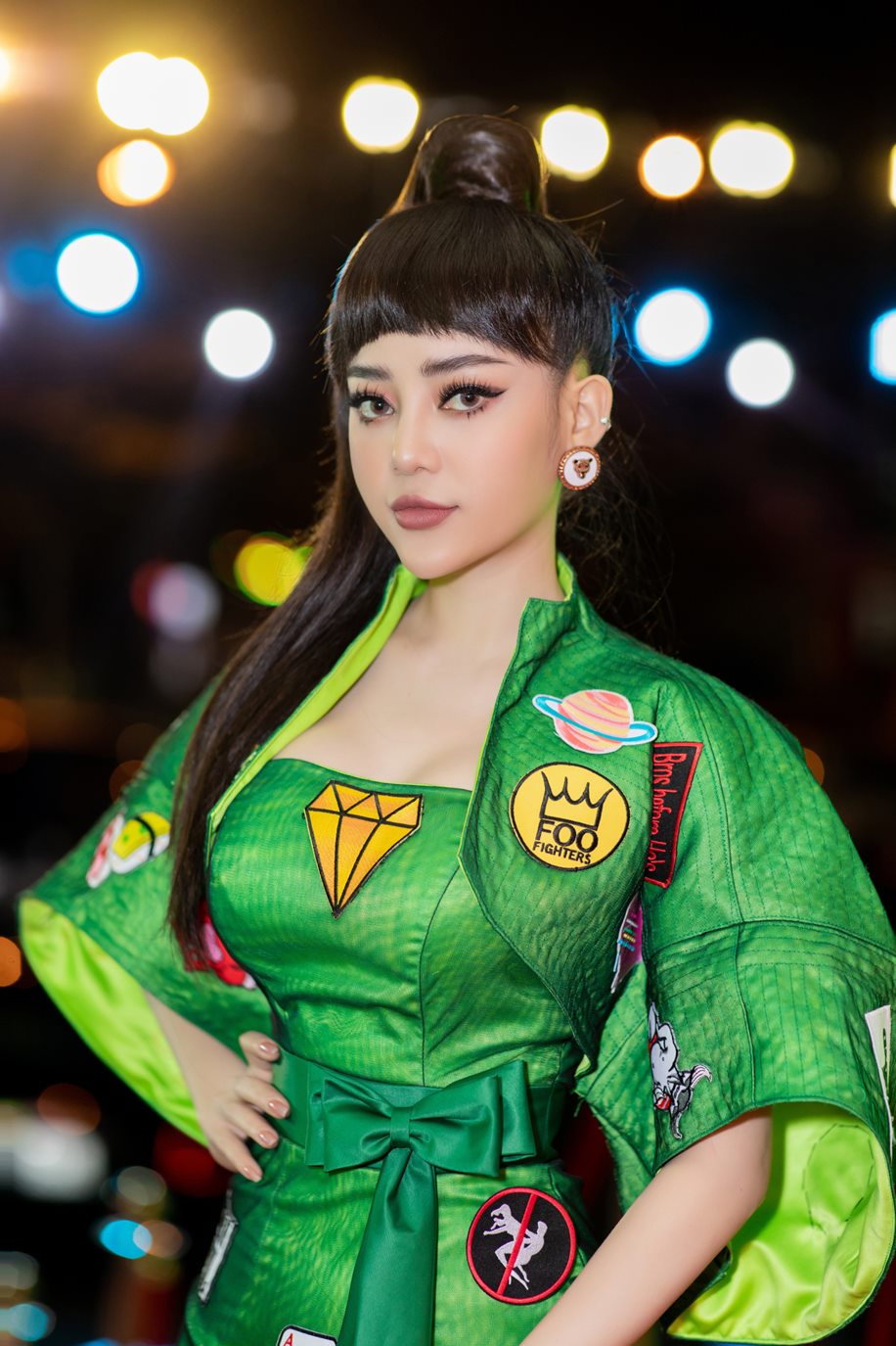 Để toát lên tinh thần của bộ trang phục, Ngọc Ny chọn kiểu tóc buộc cá tính và để mái ngố bắt mắt.