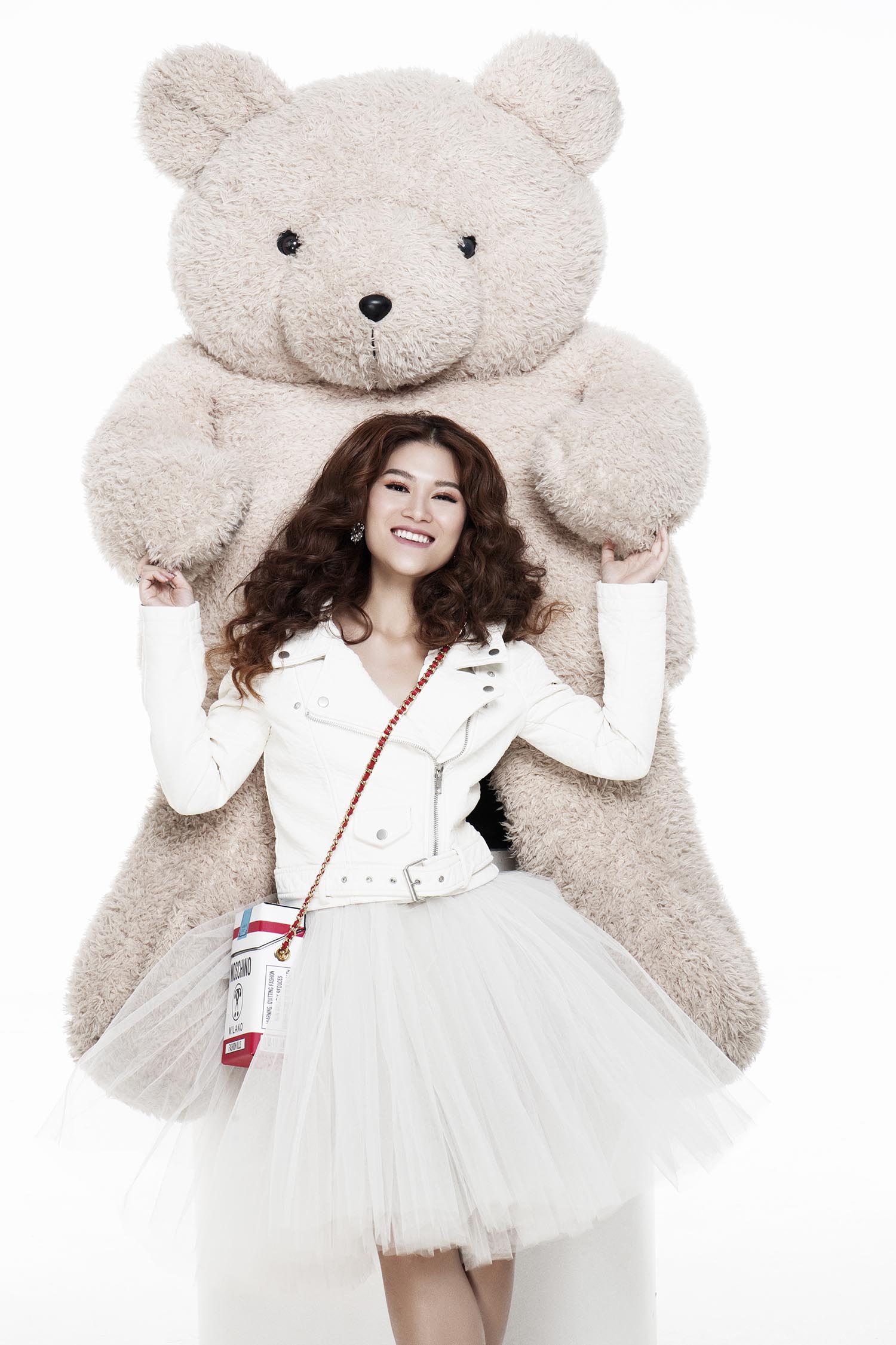 Trang phục với tông màu trắng xóa từ trên xuống với điểm nhấn là chiếc túi xách đeo chéo nhỏ xinh điểm chút sắc đỏ làm điểm nhấn cho cả set đồ.
