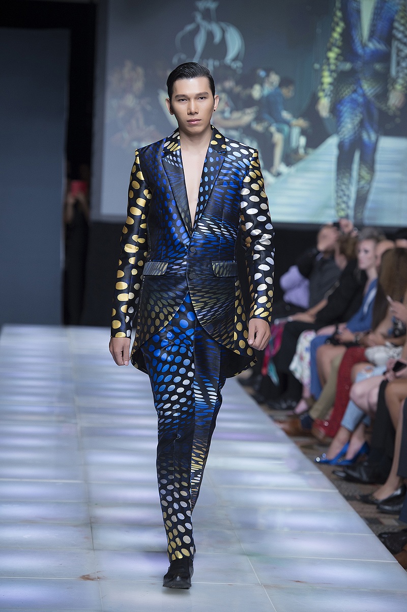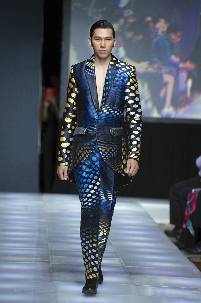 Nam vương Ngọc Tình được chọn trình diễn bộ vest nam sặc sỡ với các họa tiết lạ mắt tự tin sải bước trên sàn catwalk