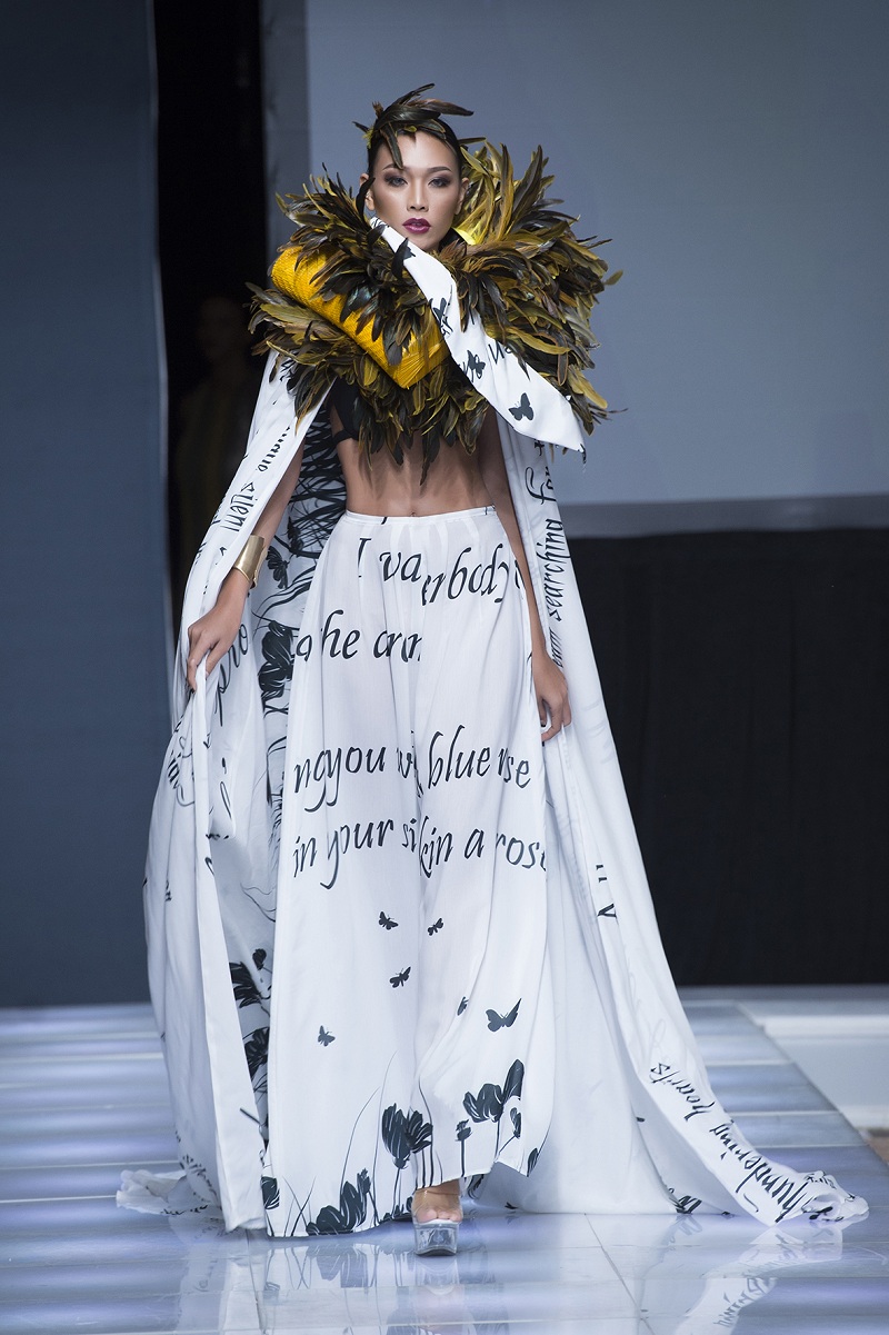 Những vần thơ do chính nhà thiết kế sáng tác in trên bộ trang phục mà siêu mẫu Diệu Huyền được mặc trên mình.