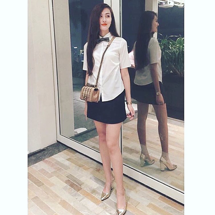 Bộ cánh ngọt ngào có phần đơn giản chỉ gồm áo sơ-mi trắng cùng chân váy ngắn là sự lựa chọn của Hà Lade khi xuống phố.