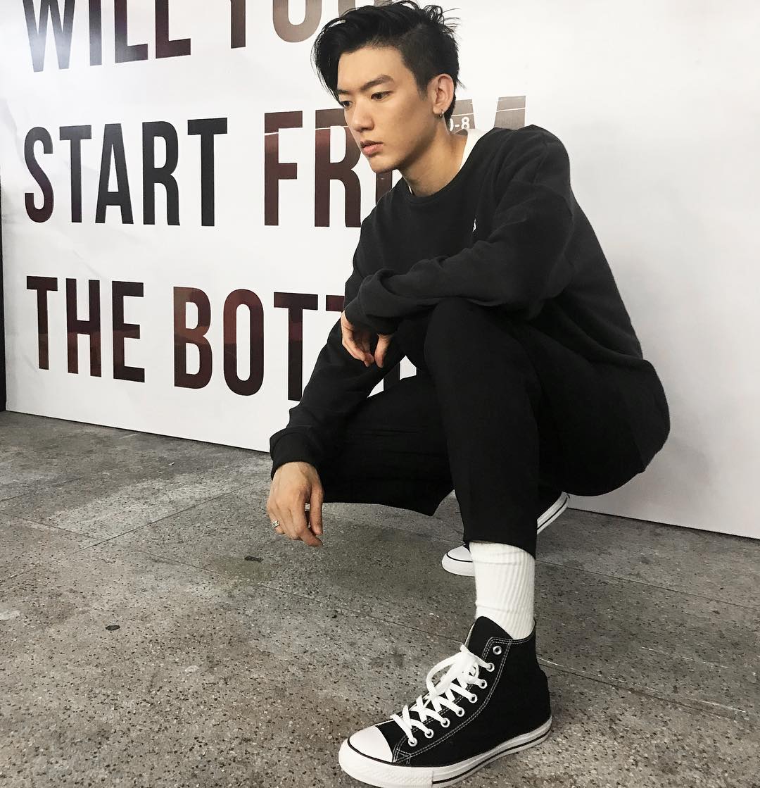Cây đồ đen chất chơi làm tăng thêm vẻ điển trai, lãng tử của người mẫu Brian Trần. Anh chàng rất tinh ý khi mix cùng với trắng và áo thun trắng bên trong, tạo nên những layer khiến tổng thể trang phục không nhàm chán.