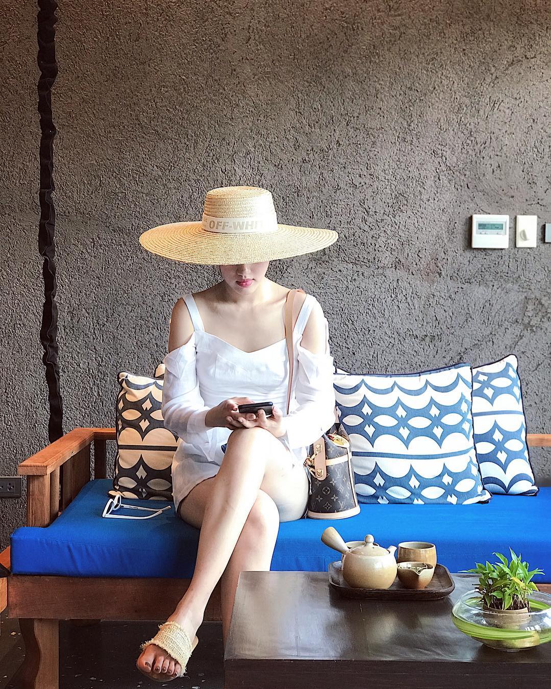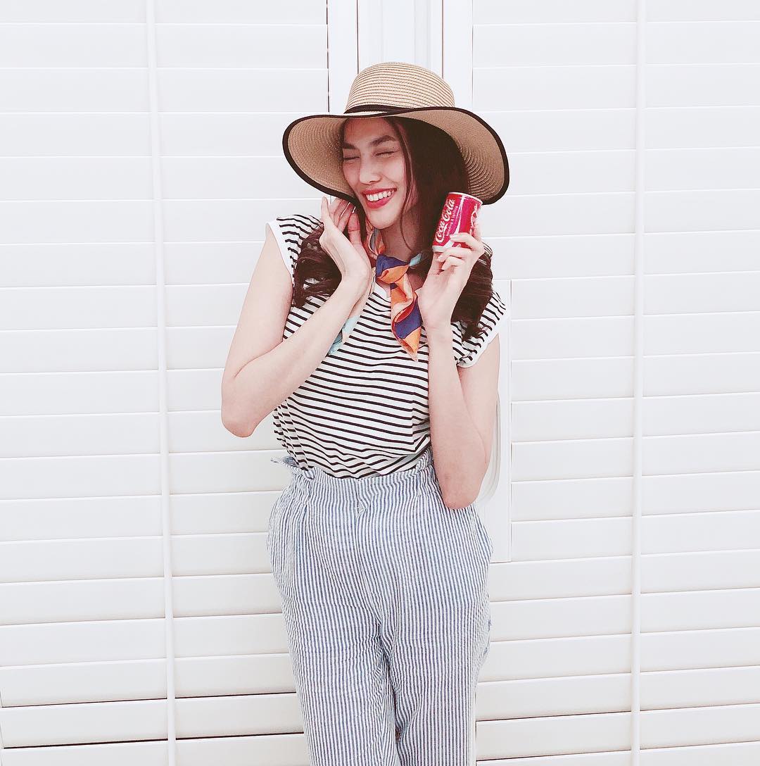 Lan Khuê đem lại không khí ngày hè cùng áo ba lỗ sọc ngang phối cùng quần sọc dọc. Cách chọn màu sắc trung tính khiến tổng thể bộ cánh của nàng Meow không hề rối, các món phụ kiện như khăn buộc cổ, nón cói cũng được dùng một cách khéo léo, tạo nên điểm nhấn cho set đồ.
