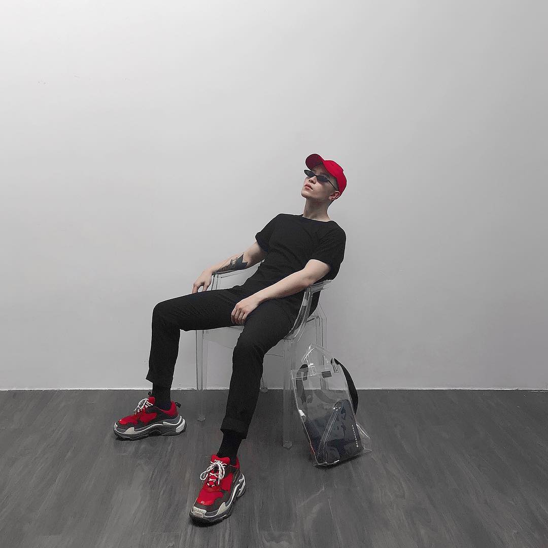 Cùng suy nghĩ với Quỳnh Anh Shyn, Kelbin Lei cũng lựa chọn tông đỏ để tạo ấn tượng khi diện cả cây đen. Chàng stylist gốc Đà Lạt còn được cộng điểm bởi cách sử dụng phụ kiện túi trong suốt đúng xu hướng.