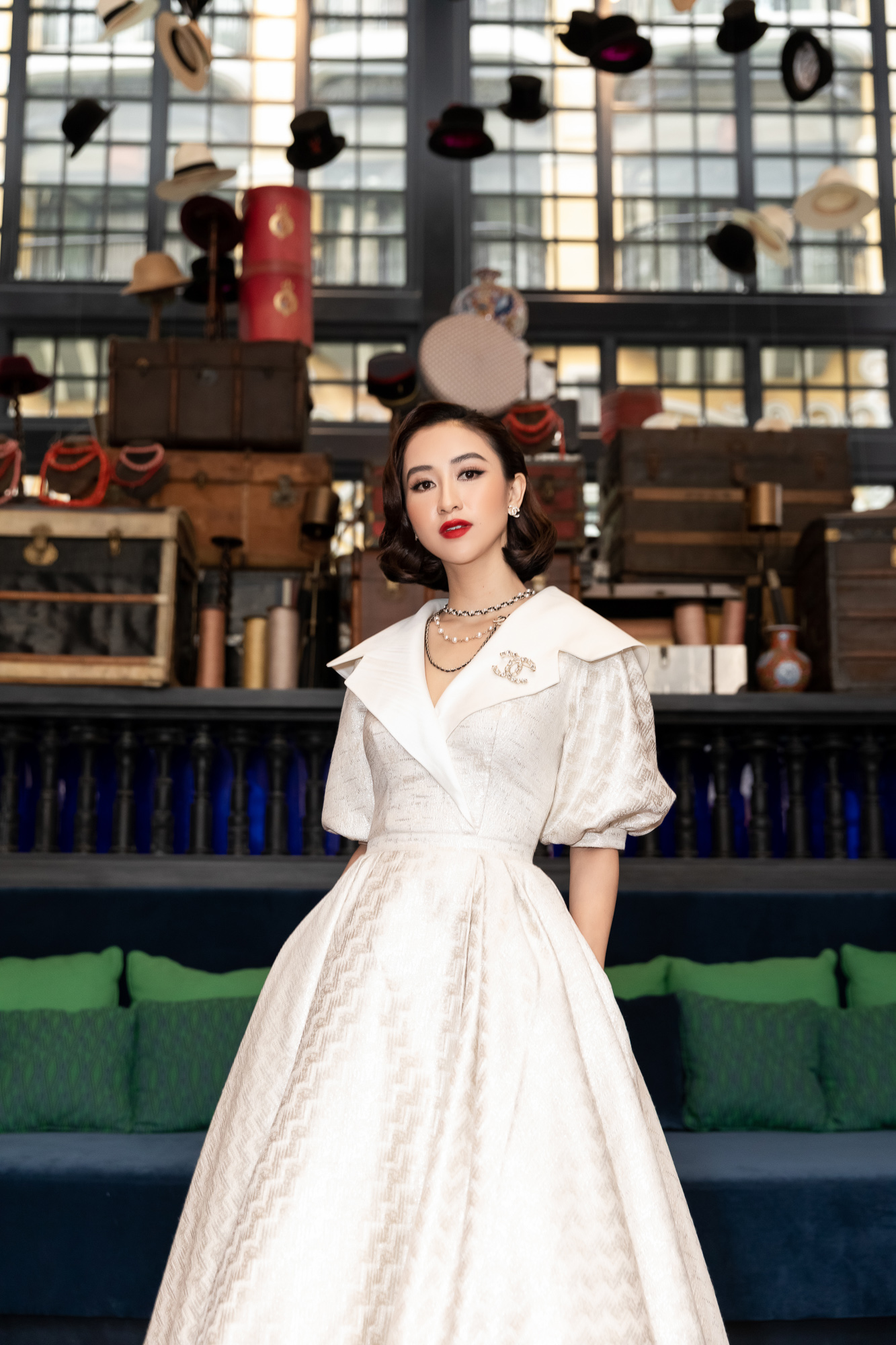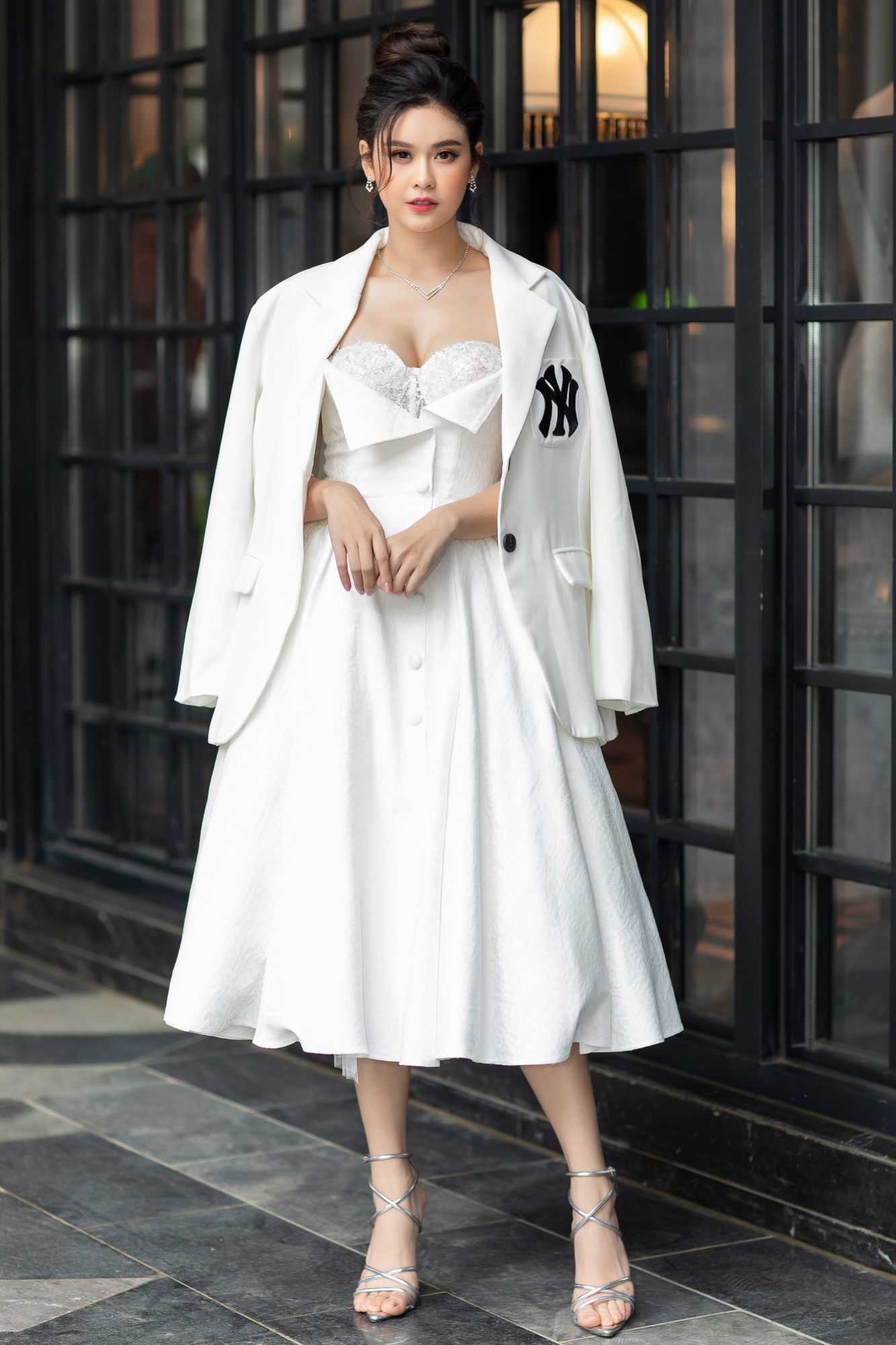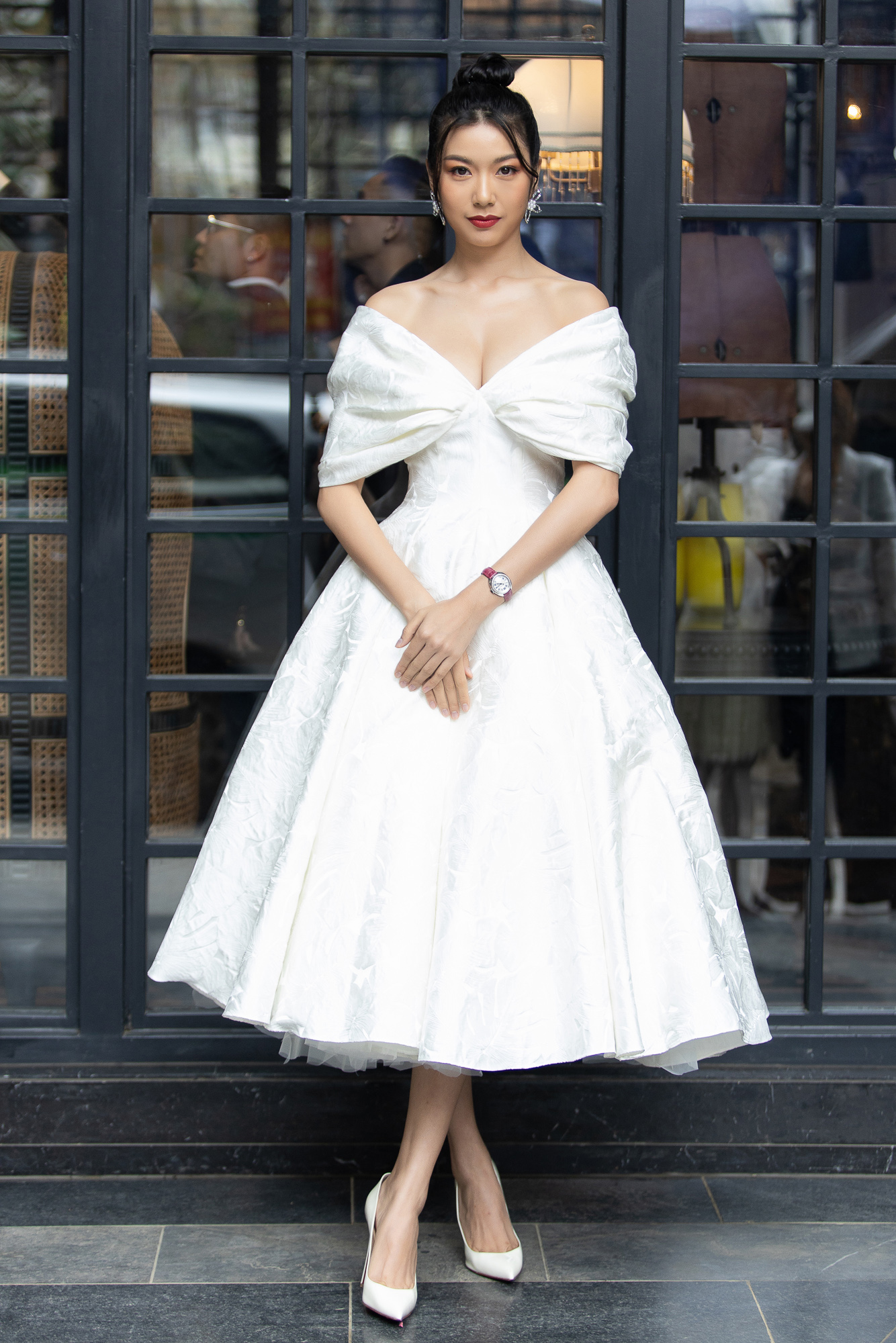 Á hậu Hà Thu mang đến nét đẹp cổ điển cùng váy trắng xòe bềnh bồng.