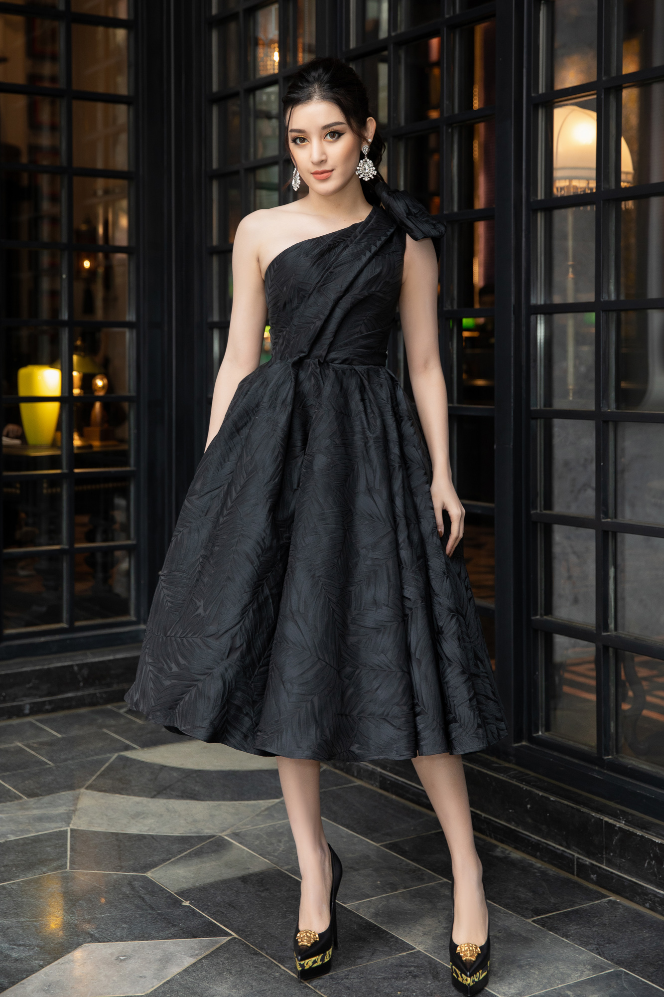 Á hậu Lệ Hằng quyến rũ trong chiếc váy đen đơn giản, người đẹp sử dụng phụ kiện làm điểm nhấn.
