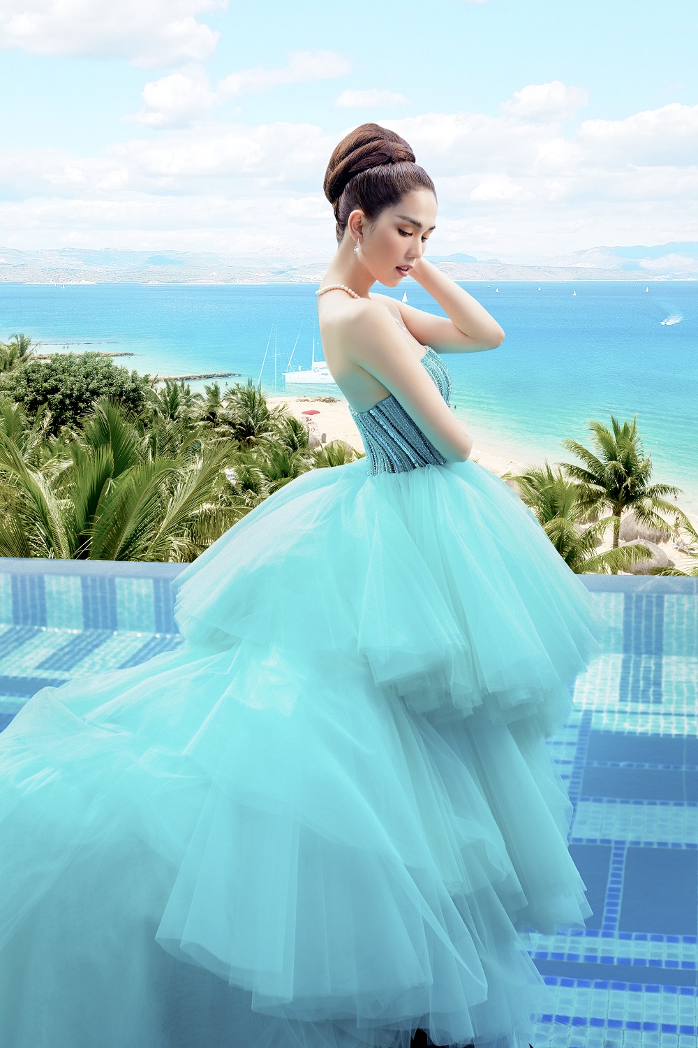 Với bộ ảnh lần này, người đẹp chọn thiết kế váy cúp ngực xanh với đuôi là ren mỏng khoe vẻ ngoài nữ tính. Diễn viên “Vu quy đại náo” lựa chọn kiểu tóc búi cao kết hợp cùng trang sức ngọc trai toát lên hình ảnh đầy quyền lực.