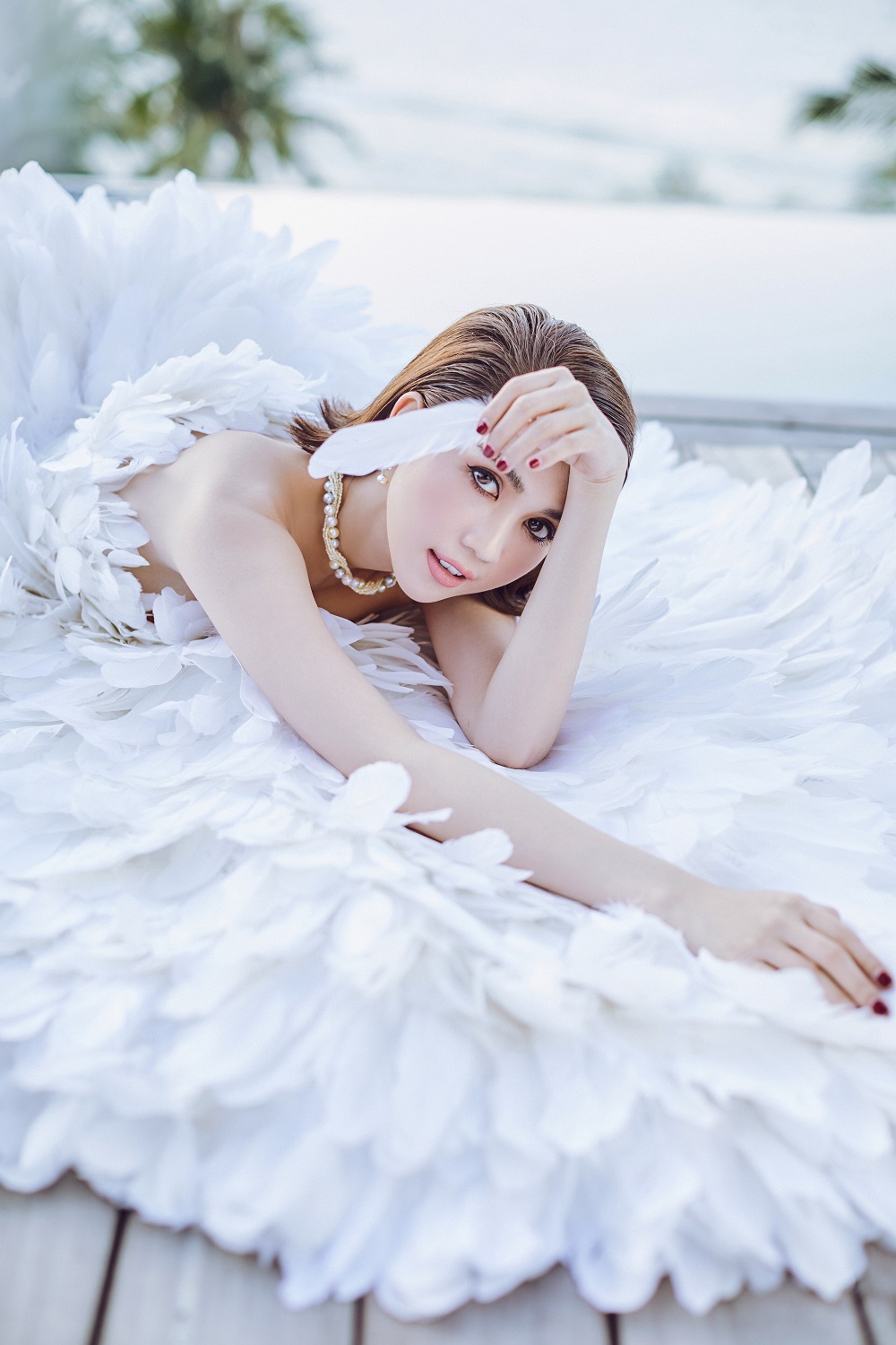 Bộ cánh thứ ba là chiếc váy lông vũ xếp tầng màu trắng. Kiểu tóc vuốt ngược cùng làn da trắng giúp người đẹp sinh năm 1989 thêm phần quyến rũ. NTK lựa chọn bối cảnh ngoài trời để thực hiện bộ ảnh này. Anh hài lòng vì bộ ảnh đã tôn lên tinh thần mà nhà thiết kế hướng đến thông qua trang phục.