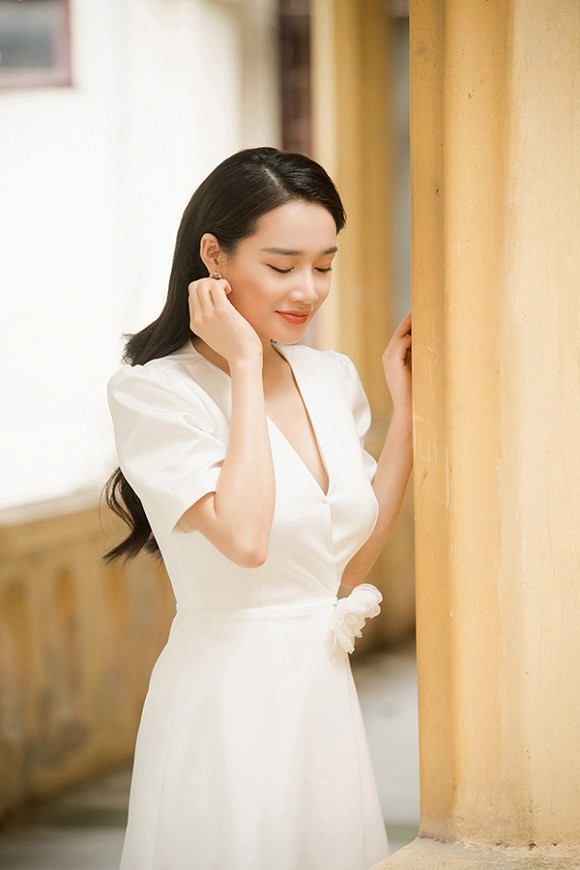 Nhã Phương là nhân vật kế tiếp trong bảng xếp hạng sao đẹp tuần này. Nữ diễn viên chọn cho mình mẫu váy trắng nhã nhặn co đính hoa ngay eo.