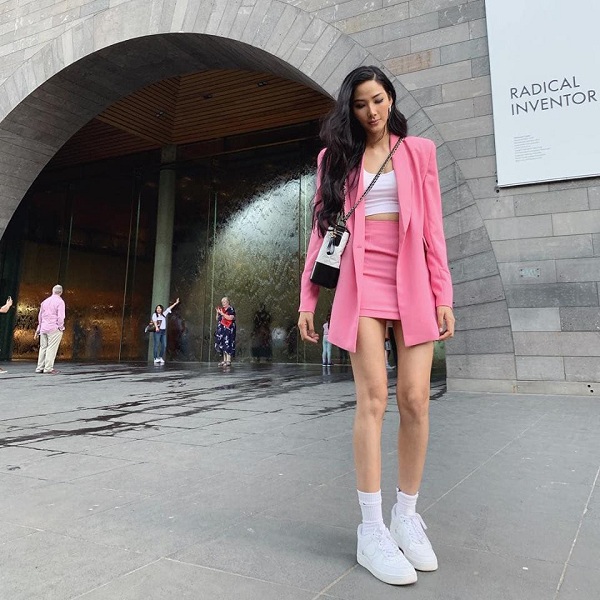 Vừa thanh lịch lại trẻ trung trong set đồ áo blazer hồng kết hợp với váy ngắn lưng cao ôm body mix cùng giày thể thao của Hoàng Thùy