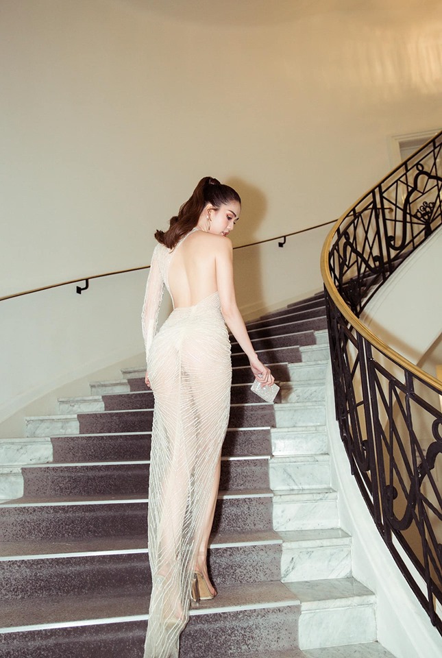 Ngọc Trinh diện đầm xuyên thấu trắng muốt. Bộ váy có những đường cắt cúp táo bạo, được đính pha lê Swarovski thủ công trong ba tuần.