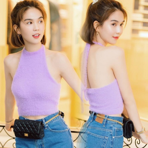 Tóc Tiên trẻ trung trong kiểu áo tím croptop mix cùng jeans lưng cao và túi xách nâu kèm theo