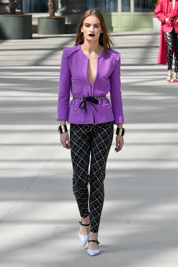 Kiểu áo khoác màu tím chất liệu len mix cùng quần sọc kẻ đen trắng được người mẫu Chanel mặc trong show Chanel Cruise 2020.