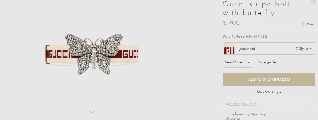 Chiếc dây nịt có mặt hình bươm bướm là mẫu mới nhất của Gucci với giá 700$ (khoảng 15 triệu đồng).
