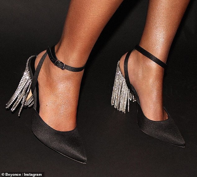 Beyonce còn “chơi trội” khi đeo kim cương từ đầu đến chân. Đôi giày đen có gắn tua kim cương là điểm nhấn khiến các tín đồ chú ý