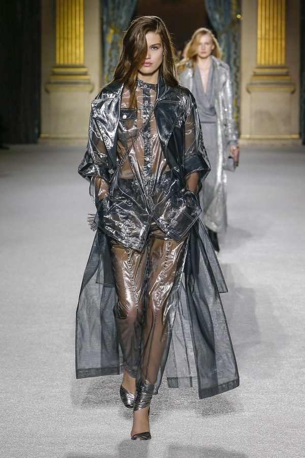 Kết hợp cùng đó là áo choàng cùng sơ mi và quần được diện cả cây, sử dụng chất liệu PVC xuyên thấu. Để thể hiện đúng tinh thần mẫu thiết kế, các người mẫu cũng phải thả rông ngực khi trình diễn.