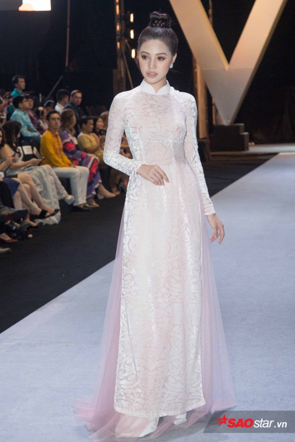 Jolie Nguyễn xứng danh là hoa hậu chăm đầu tư cho vẻ ngoài nhất khi cùng tham dự một sự kiện, 'hoa hậu con nhà giàu' lại thay đổi đến hai bộ trang phục khác nhau, mà bộ nào cũng đẹp, một lần là thiết kế áo dài trắng, phối voan nền nã.