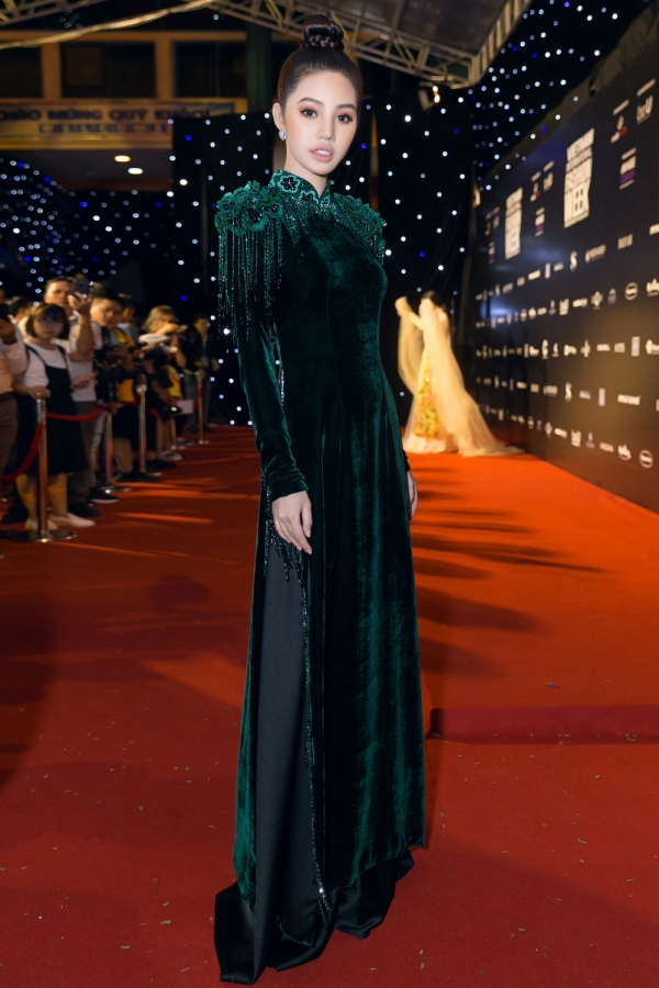 Lần hai là tà áo dài đen, chất liệu nhung, được đính kết tỉ mỉ tại phần cầu vai, giúp người đẹp trông vừa sang trọng mà lại không bị già dặn.