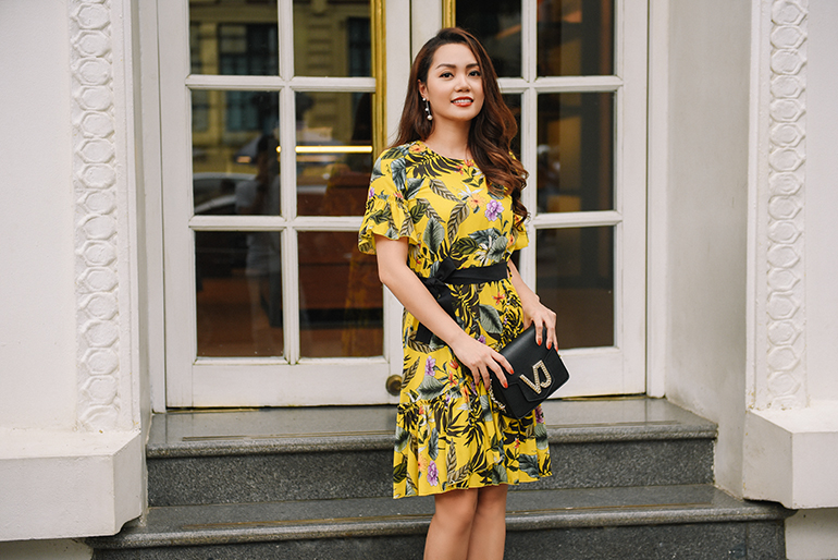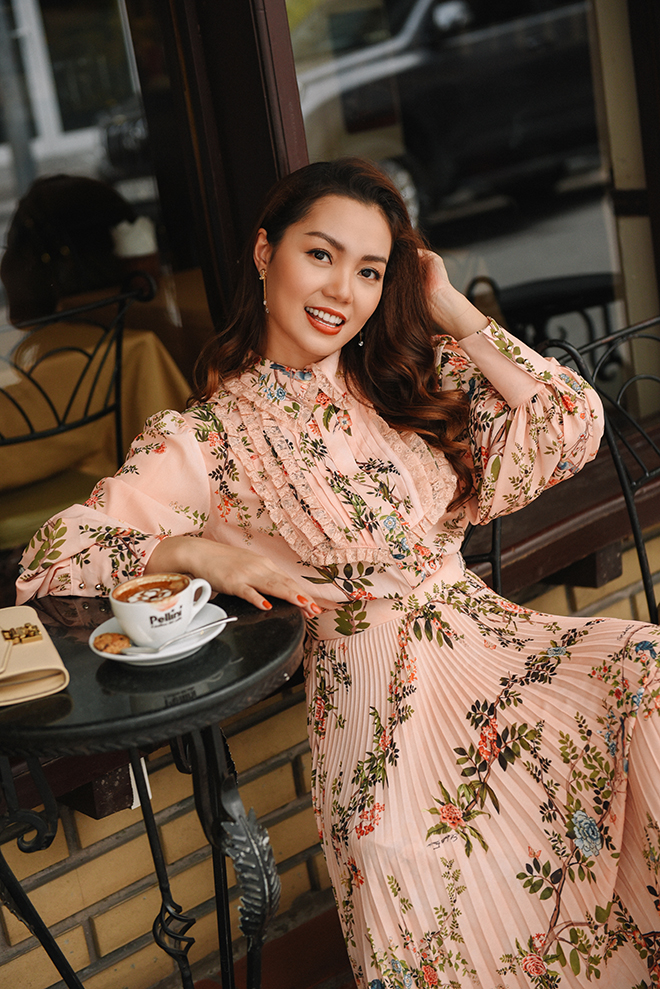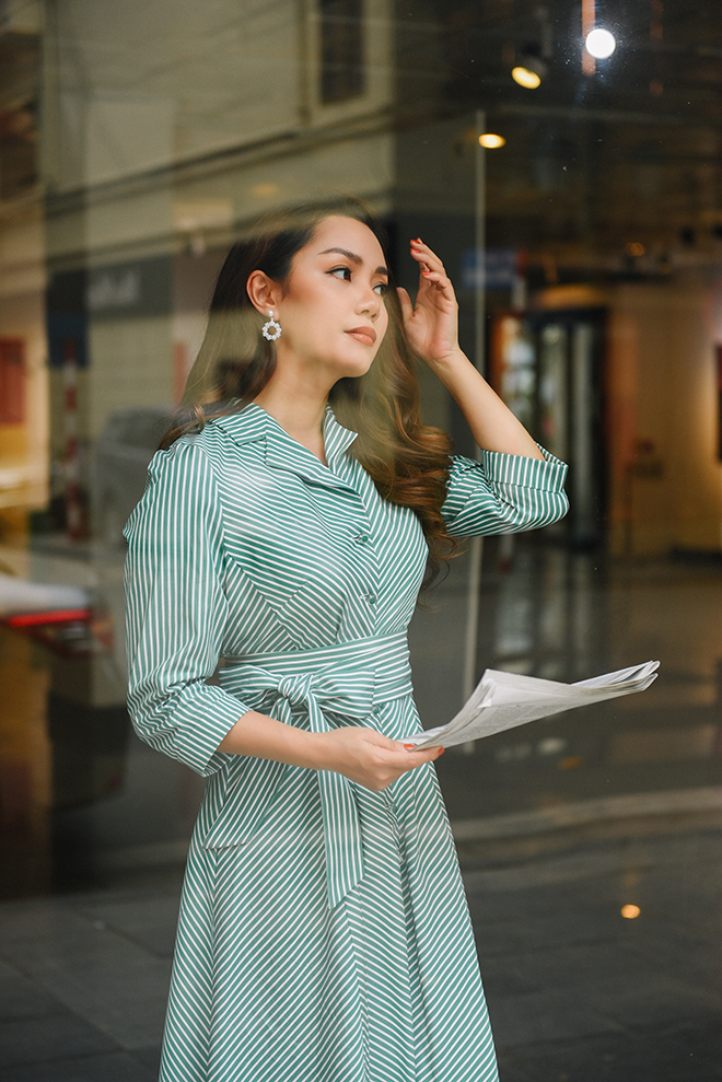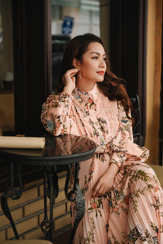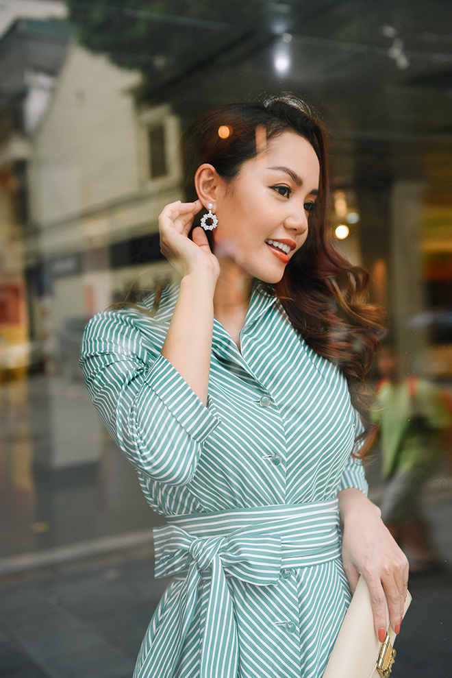Nữ ca sĩ hấp dẫn mọi ánh mắt khi toả rạng rực rỡ với bộ đầm sắc hồng hoạ tiết hoa lá nhẹ nhàng, cô dịu dàng duyên dáng với bộ đầm kẻ sọc xanh mát mắt, thanh lịch, và cực kỳ quyến rũ với bộ đầm trắng khoe vai trần nuột nà