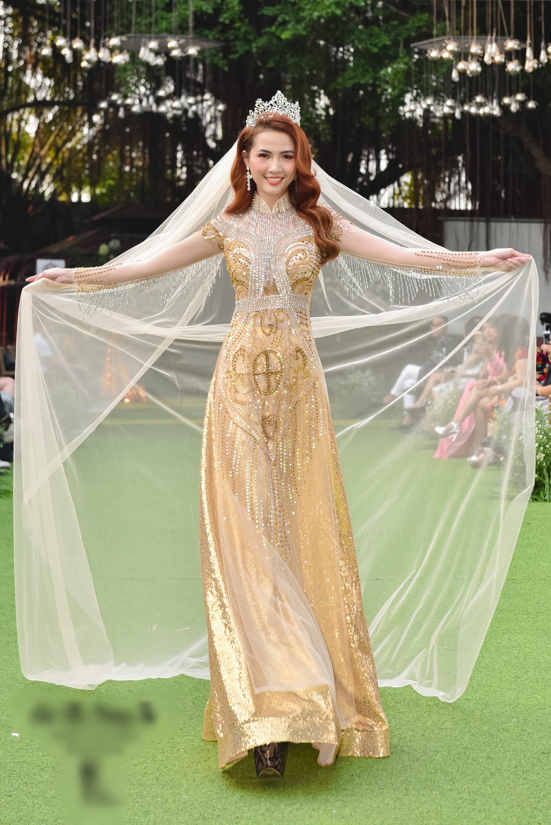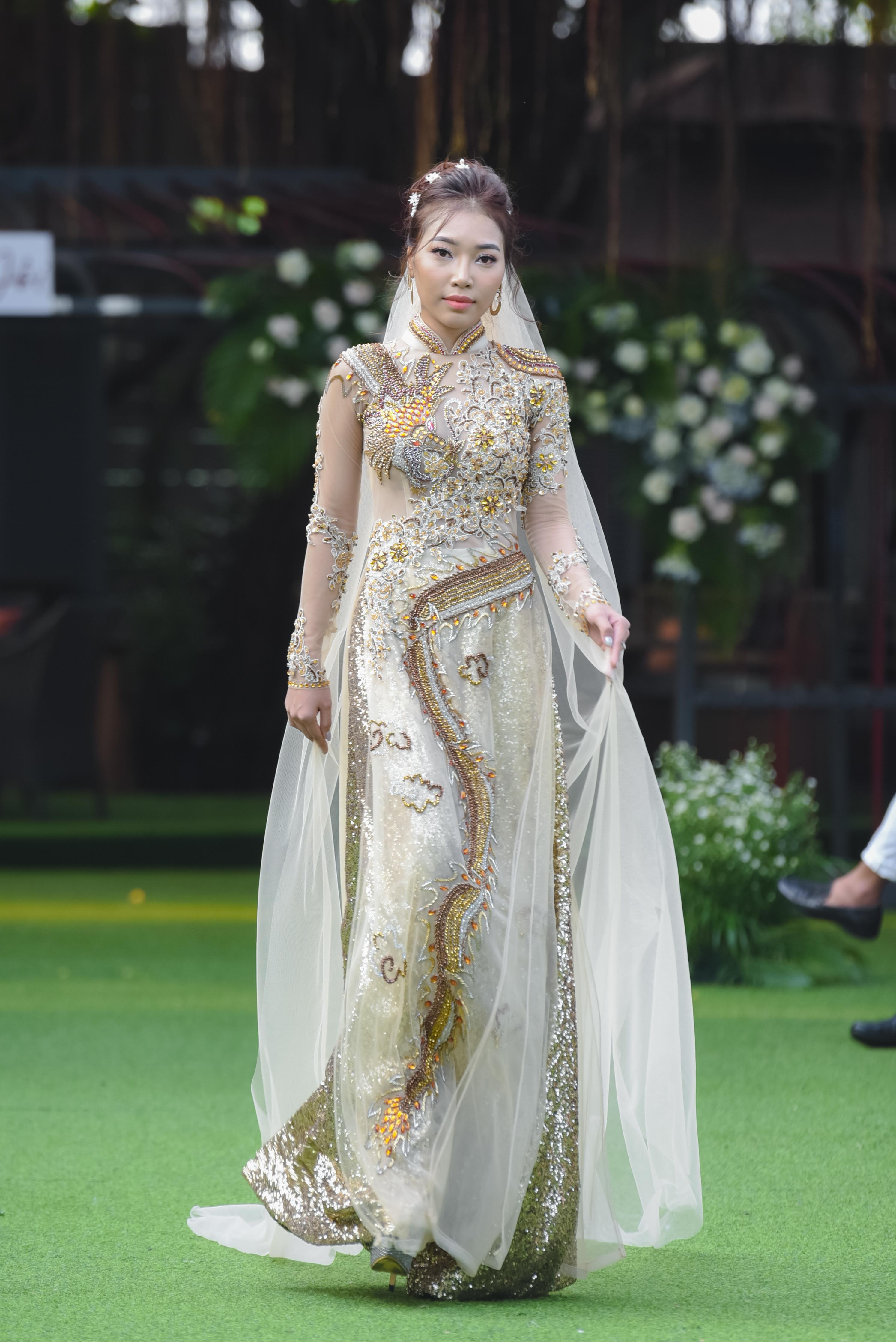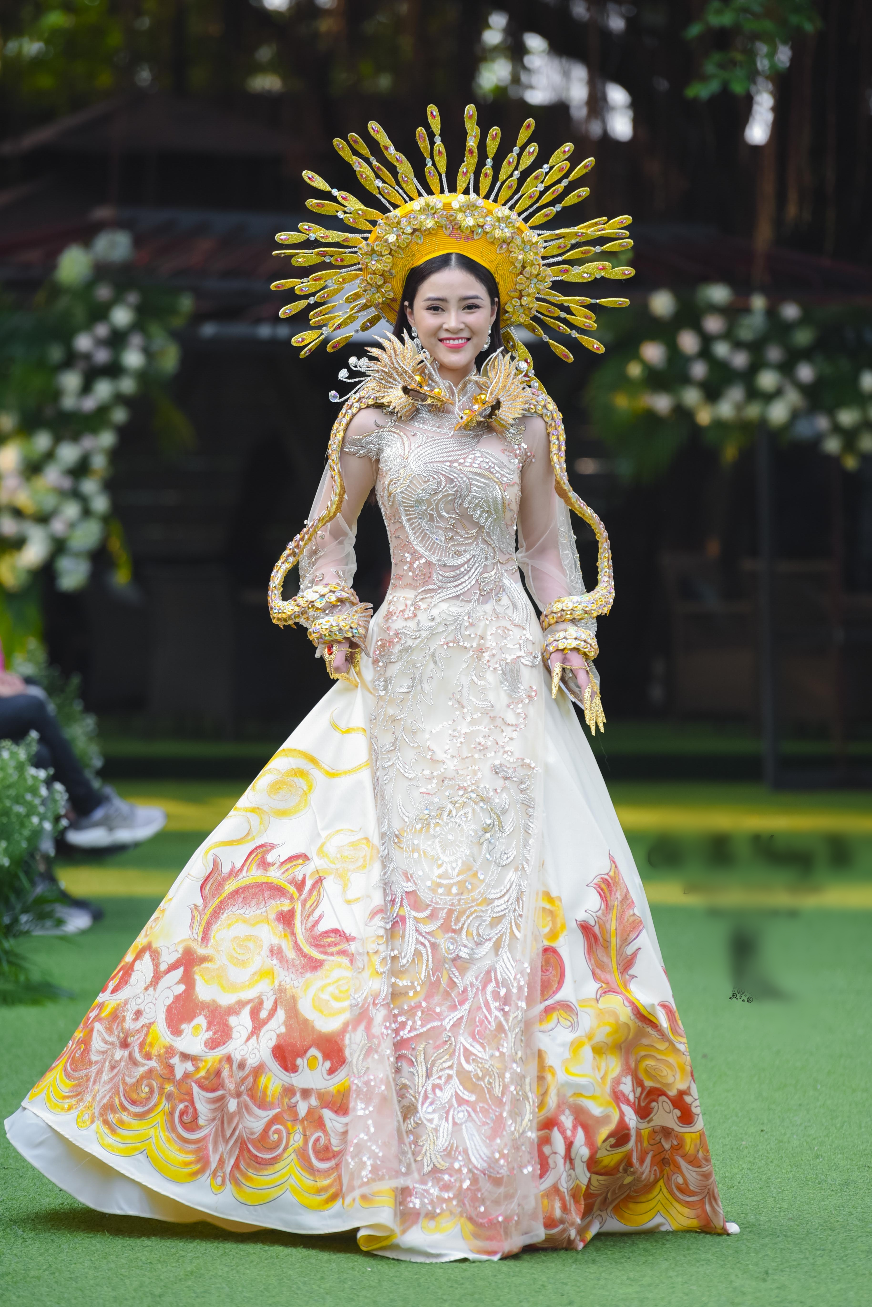 Á hậu Lý Kim Thảo đảm nhận vị trí vedette, cô diện chiếc áo dài gồm lưới kết hợp với lụa tơ tằm. Họa tiết vẽ khối 3D rồng phụng, điểm nhấn là hai con rồng trên tay và chiếc mấn khá “nặng ký”.