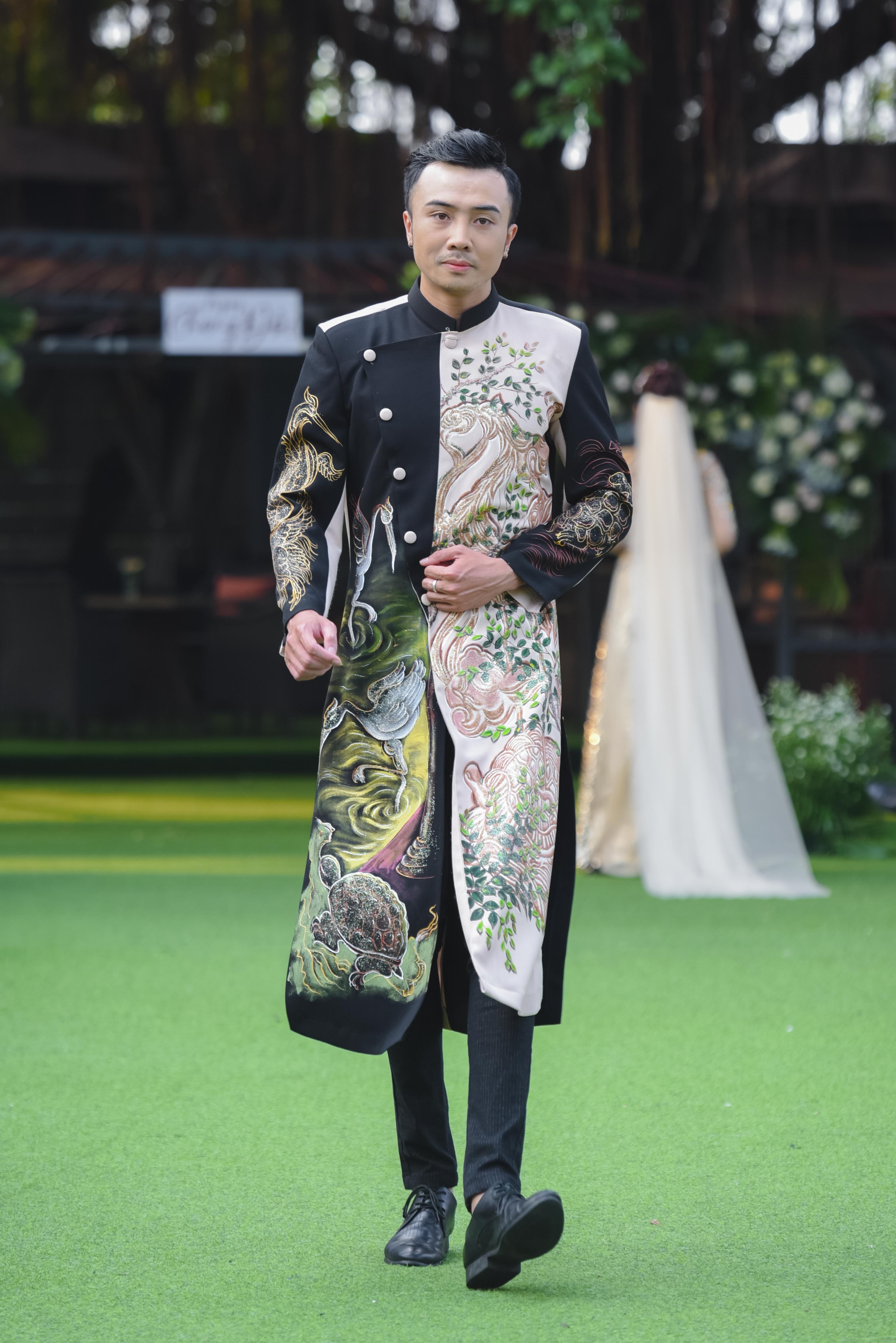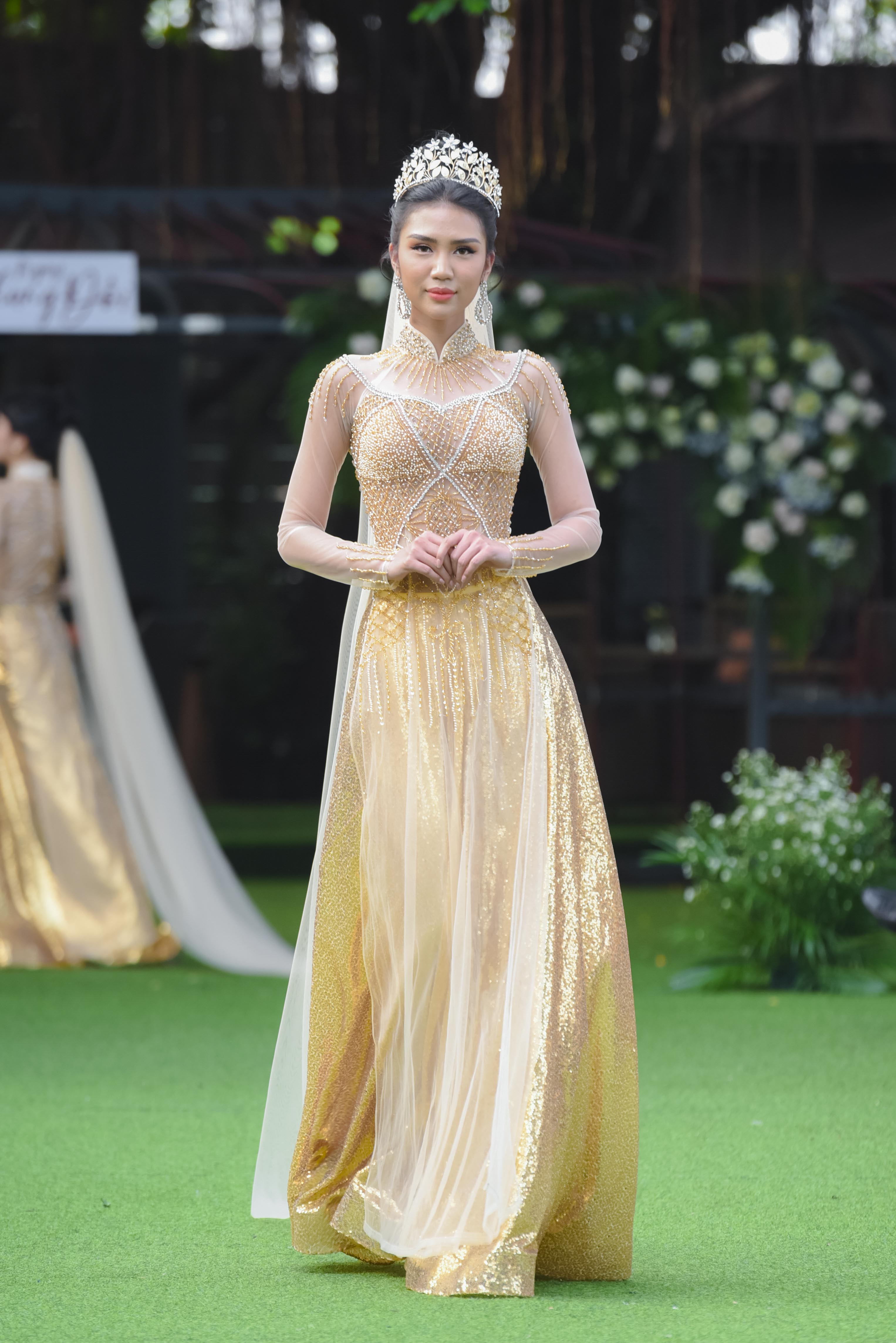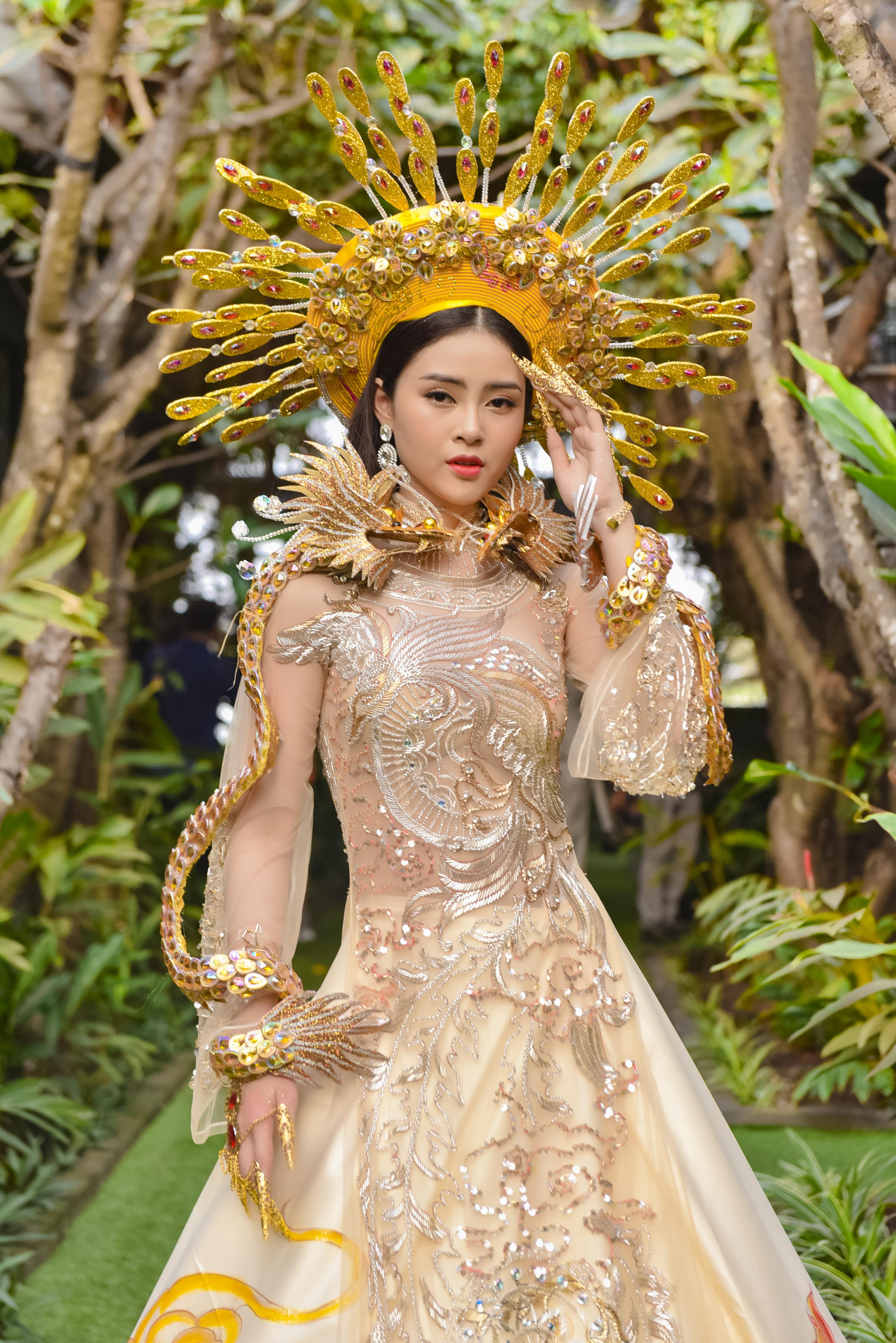 Á hậu Lý Kim Thảo đảm nhận vị trí vedette, cô diện chiếc áo dài gồm lưới kết hợp với lụa tơ tằm. Họa tiết vẽ khối 3D rồng phụng, điểm nhấn là hai con rồng trên tay và chiếc mấn khá “nặng ký”.