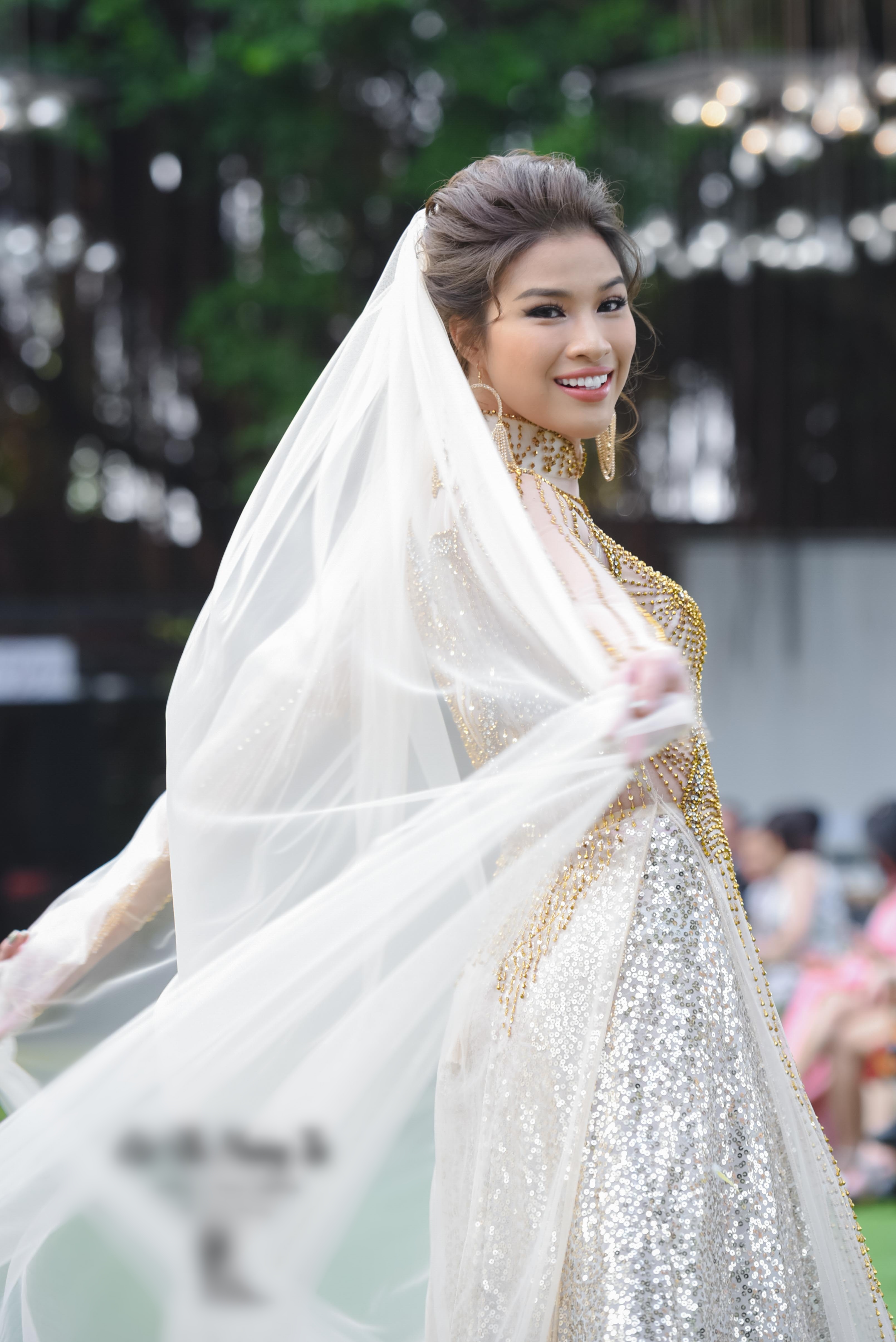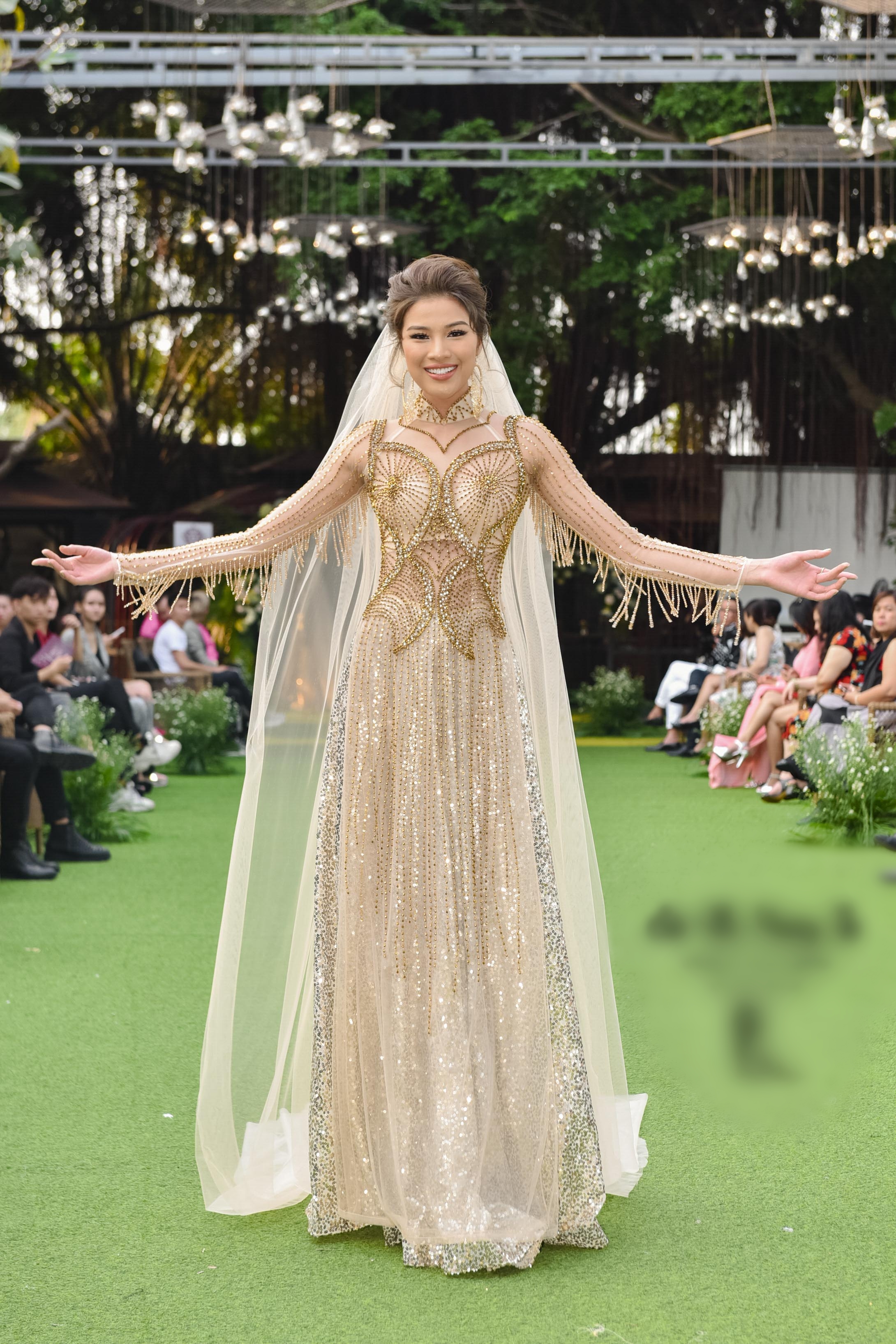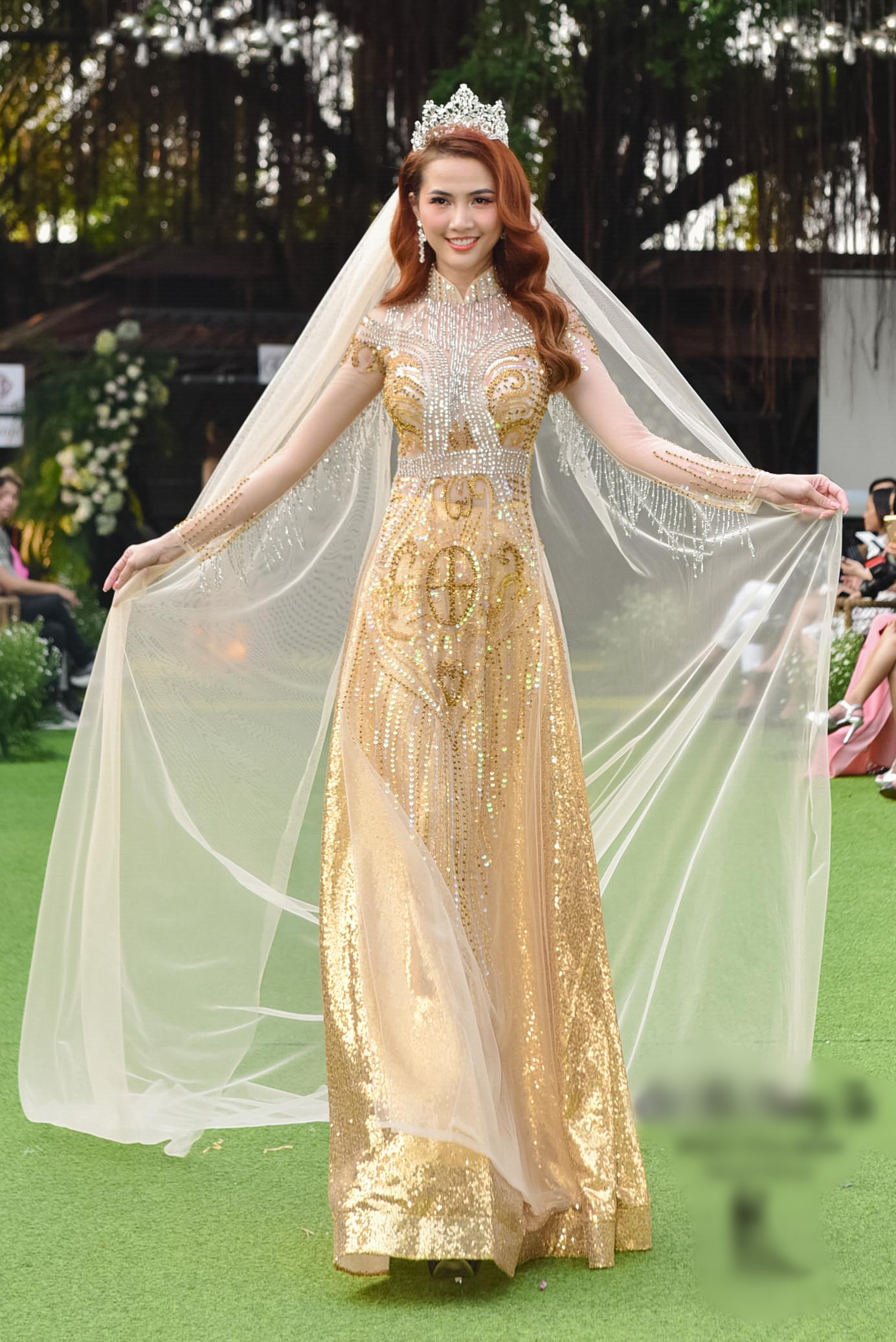 Thần thái và vẻ đẹp của nàng hậu như thu hết mọi ánh nhìn khi cô khoác trên mình chiếc áo dài lộng lẫy. Cũng đã khá lâu cô mới trở lại sàn catwalk nhưng cô đã hoàn thành xuất sắc vai trò của mình.