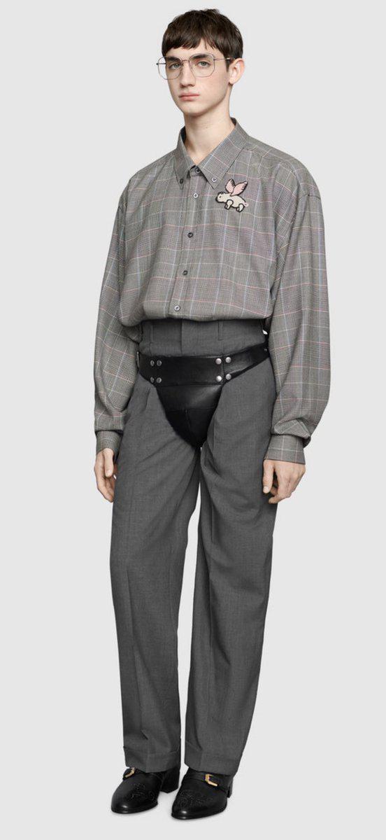 Tín đồ thời trang thấy vô cùng khó hiểu khi thương hiệu Gucci cho ra mắt kiểu nội y làm bằng da, lấy cảm hứng từ các đấu sĩ thành Rome ở Italy. Chiếc quần được nhà mốt Ý kết hợp ngoài quần tây, để lộ những điểm nhạy cảm trên cơ thể của nam giới. Thiết kế thuộc BST Xuân - Hè 2019 từng được trình diễn tại tuần lễ thời trang Milan.