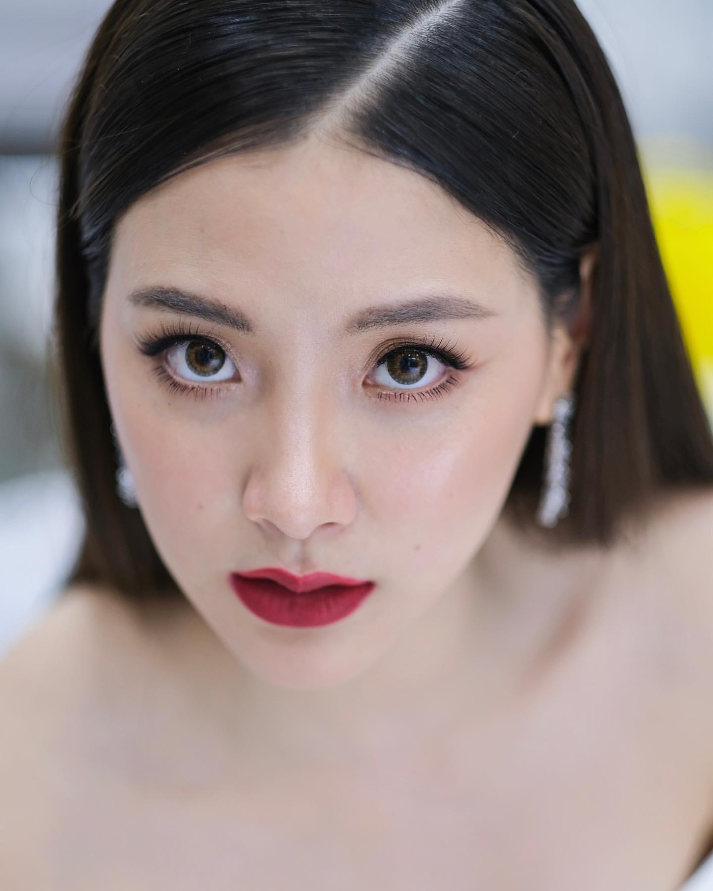 Ngược lại với Nhã Phương, Baifern Pimchanok lại chọn lối trang điểm đậm, đặc biệt nhấn vào đôi mắt với hàng lông mi đen nhánh cùng phần lông mày được kẻ sắc nét. Mỹ nhân Thái cũng tạo khối rõ hơn và chọn son đậm đầy ấn tượng. về phần làm tóc người đẹp chọn kiểu tóc thẳng khá đơn giản nhưng lại rẽ ngôi độc đáo.