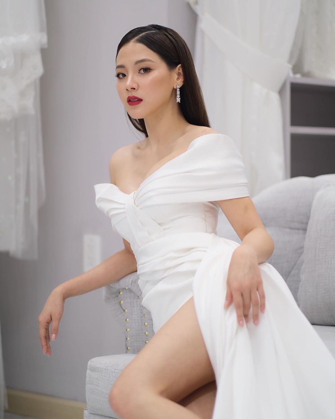 Bà xã Trường Giang chọn cho mình một thiết kế đầm trắng trễ vai với đường xẻ cao hút tầm mắt. Thiết kế với gam màu trắng tinh khôi tôn trọn nhan sắc ngọt ngào của Nhã Phương. Chi tiết trễ vai khéo khoe đôi gò bồng đào gợi cảm của bà mẹ 1 con.